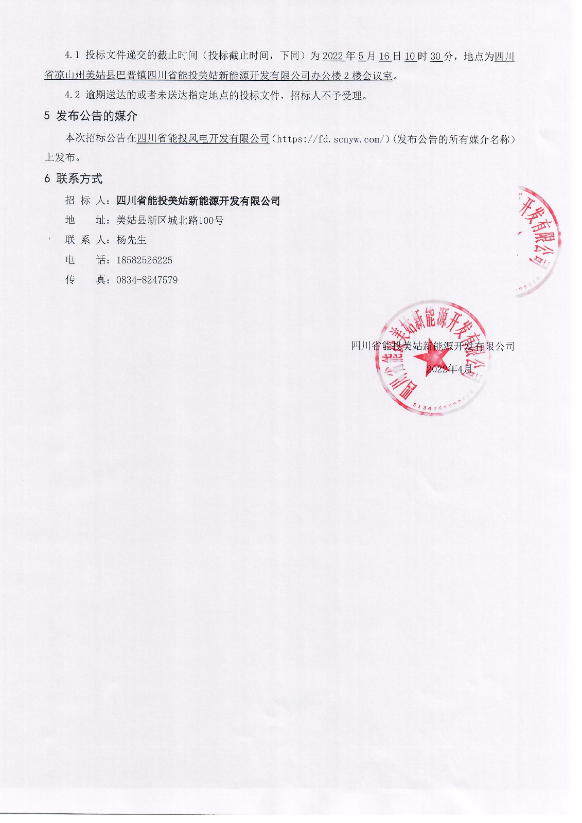 4.1 投标文件递交的截止时间(投标截止时间,下同)为2022年5月16日10时30分,地点为四川省凉山州美姑县巴普镇四川省能投美姑新能源开发有限公司办公楼2楼会议室。