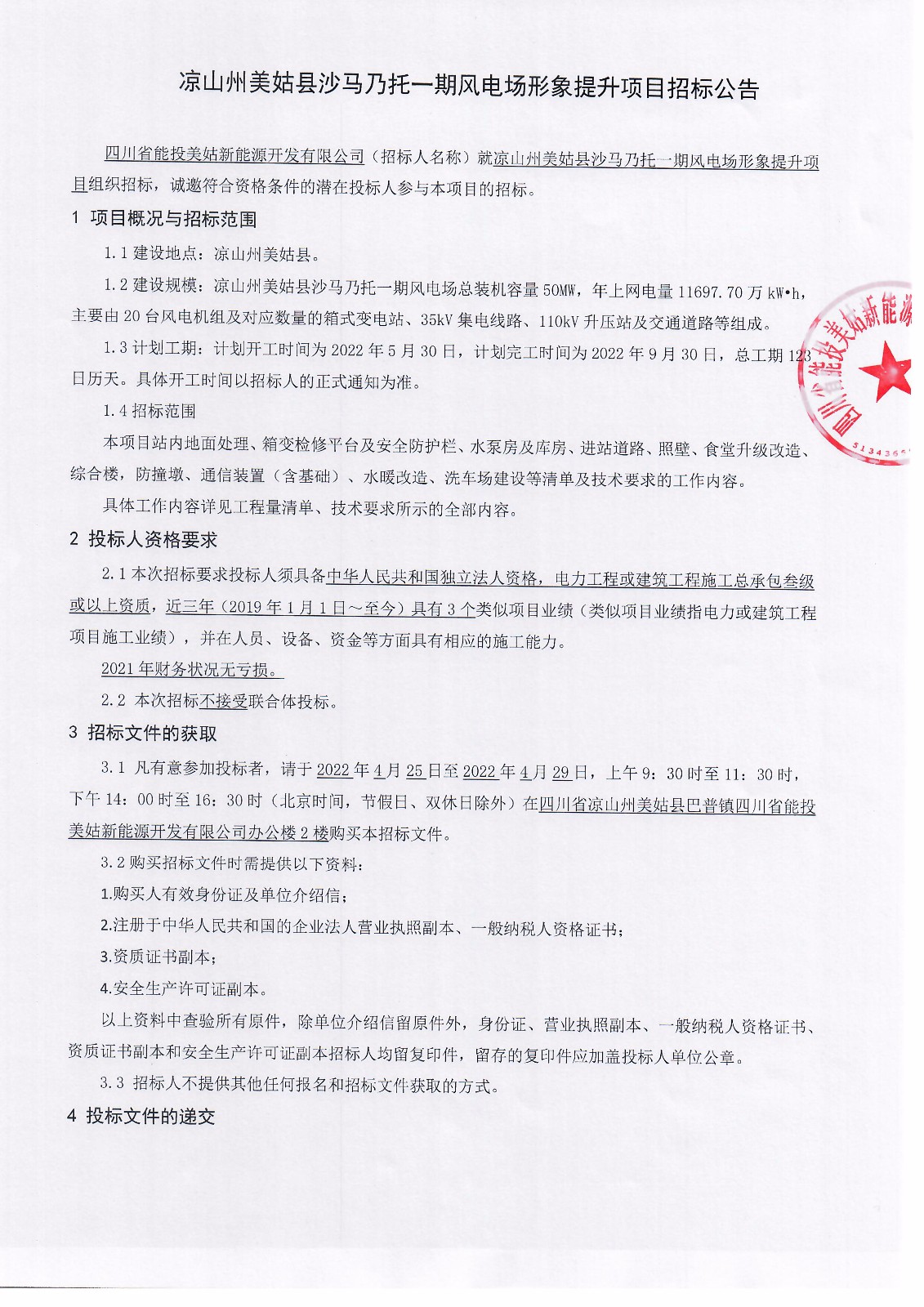 四川省能投美姑新能源开发有限公司(招标人名称)就凉山州美姑县沙马乃托一期风电场形象提升项目组织招标,诚邀符合资格条件的潜在投标人参与本项目的招标。