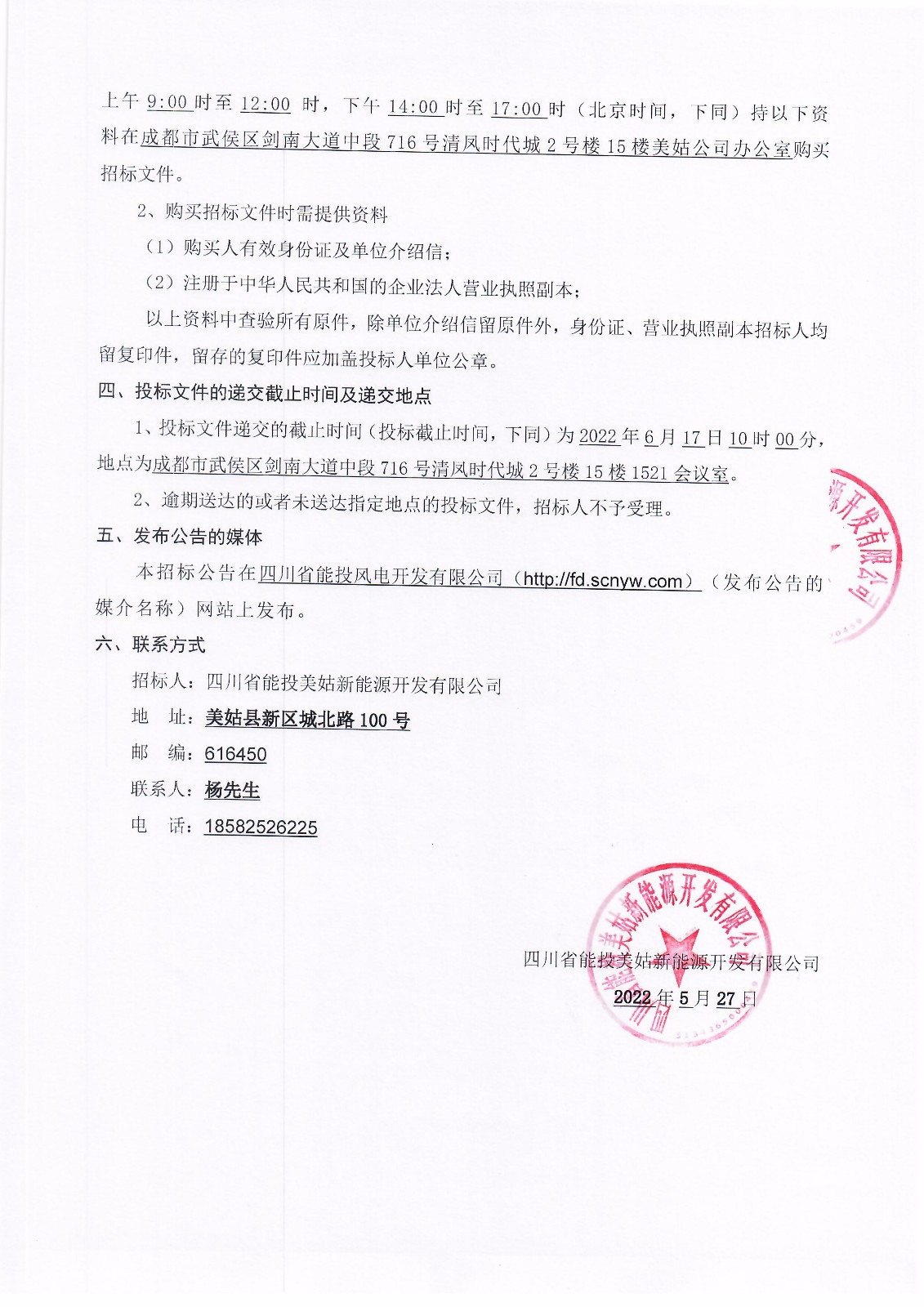 本招标公告在四川省能投风电开发有限公司(http://fd.scnyw.com)(发布公告的媒介名称)网站上发布。