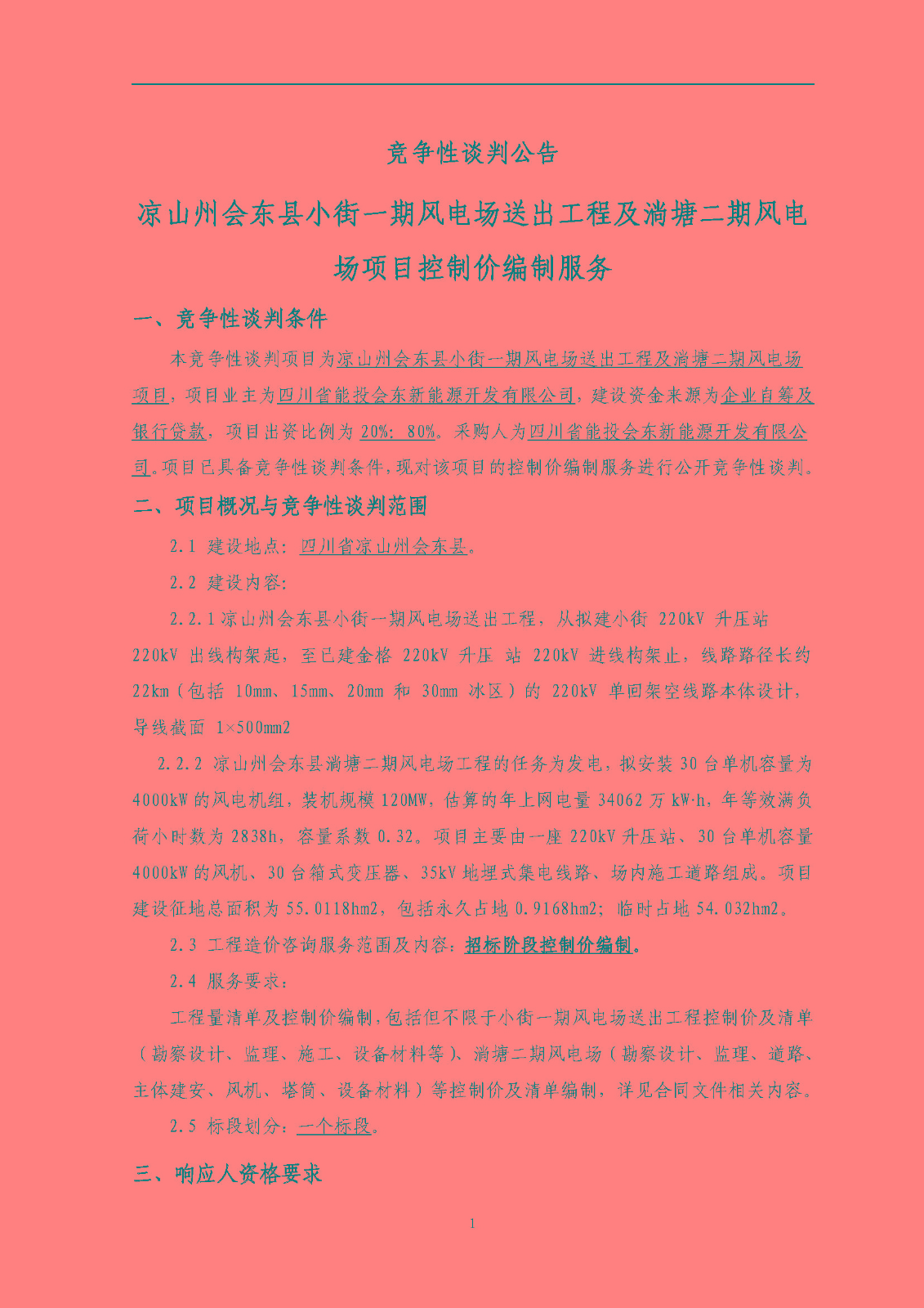 本竞争性谈判项目为凉山州会东县小街一期风电场送出工程及淌塘二期风电场项目,项目业主为四川省能投会东新能源开发有限公司,建设资金来源为企业自筹及银行贷款,项目出资比例为20%:80%。采购人为四川省能投会东新能源开发有限公司。项目已具备竞争性谈判条件,现对该项目的控制价编制服务进行公开竞争性谈判。