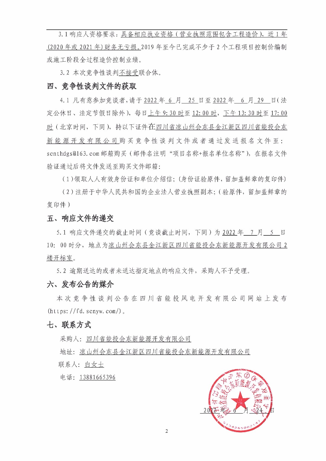 4.1 凡有意参加竞谈者,请于2022年 6 月 25 日至2022年 6 月 29 日(法定公休日、法定节假日除外),每日上午9:30时至12:00时,下午13:30时至17:00时(北京时间,下同),持以下证件在四川省凉山州会东县金江新区四川省能投会东新能源开发有限公司购买竞争性谈判文件或者通过发送报名文件至:scnthdgs@163.com邮箱购买(邮件名注明“项目名称+报名单位名称”),在报名文件验证通过后将文件发送至购买文件邮箱: