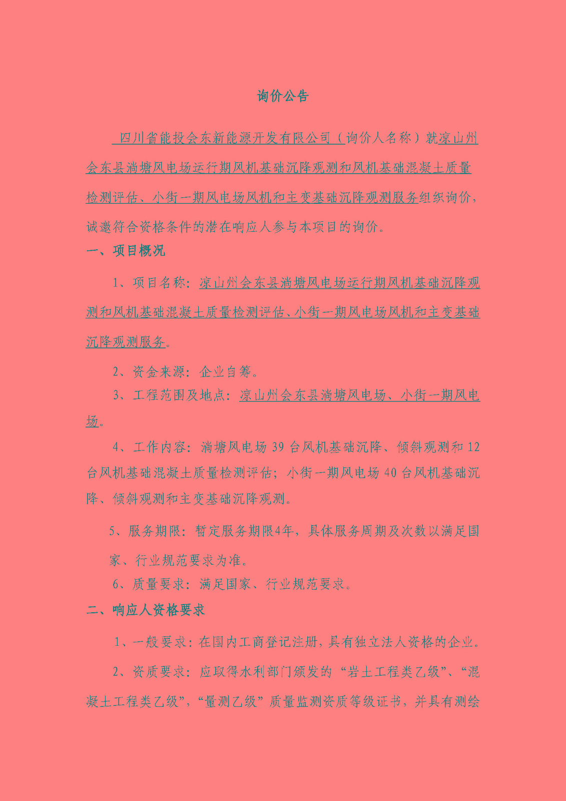 四川省能投会东新能源开发有限公司(询价人名称)就凉山州会东县淌塘风电场运行期风机基础沉降观测和风机基础混凝土质量检测评估、小街一期风电场风机和主变基础沉降观测服务组织询价,诚邀符合资格条件的潜在响应人参与本项目的询价。