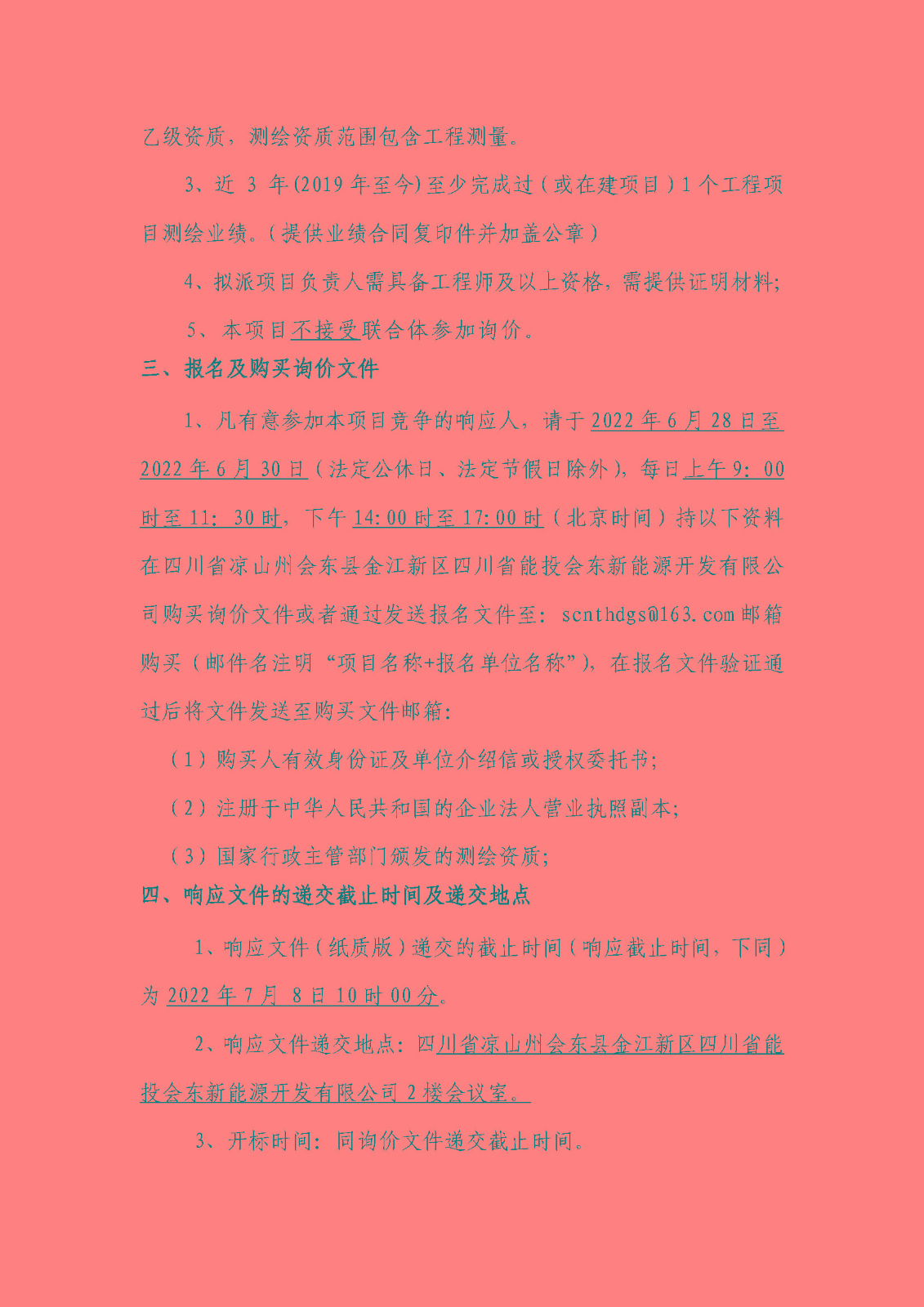 1、凡有意参加本项目竞争的响应人,请于2022年6月28日至2022年6月30日(法定公休日、法定节假日除外),每日上午9:00时至11:30时,下午14:00时至17:00时(北京时间)持以下资料在四川省凉山州会东县金江新区四川省能投会东新能源开发有限公司购买询价文件或者通过发送报名文件至:scnthdgs@163.com邮箱购买(邮件名注明“项目名称+报名单位名称”),在报名文件验证通过后将文件发送至购买文件邮箱: