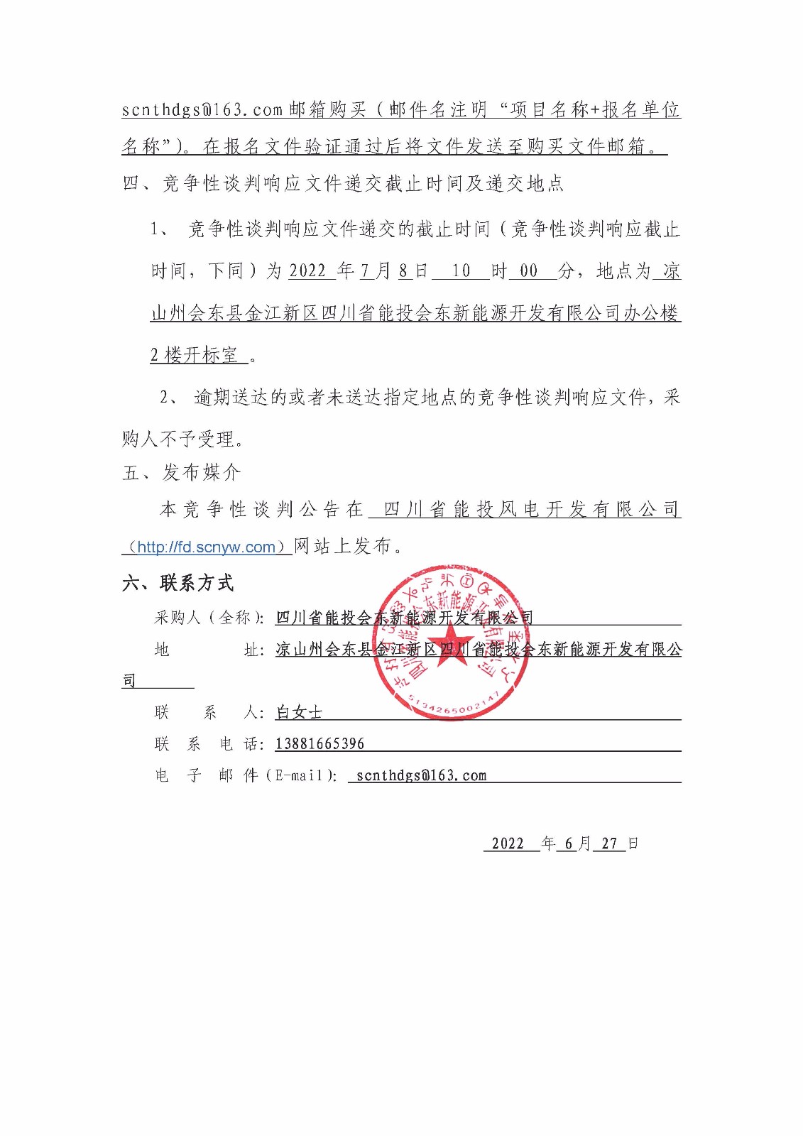 1、 竞争性谈判响应文件递交的截止时间(竞争性谈判响应截止时间,下同)为2022 年7月8日 10 时 00 分,地点为 凉山州会东县金江新区四川省能投会东新能源开发有限公司办公楼2楼开标室 。