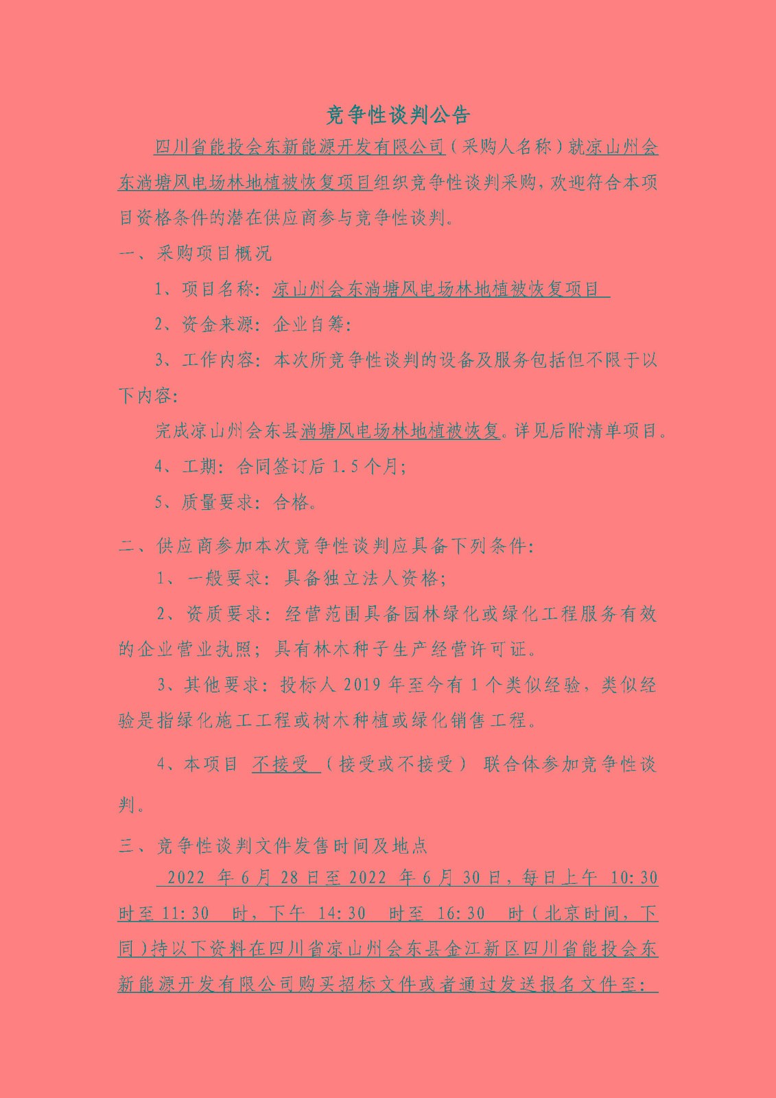 四川省能投会东新能源开发有限公司(采购人名称)就凉山州会东淌塘风电场林地植被恢复项目组织竞争性谈判采购,欢迎符合本项目资格条件的潜在供应商参与竞争性谈判。