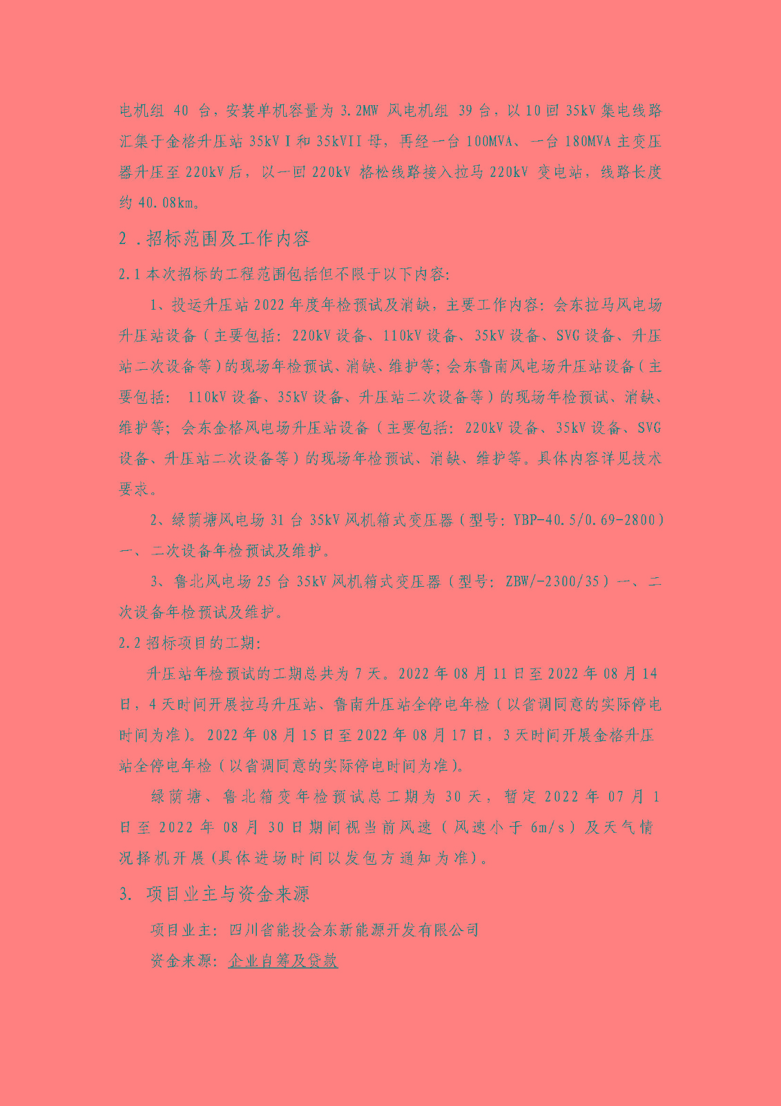 1、投运升压站2022年度年检预试及消缺,主要工作内容:会东拉马风电场升压站设备(主要包括:220kV设备、110kV设备、35kV设备、SVG设备、升压站二次设备等)的现场年检预试、消缺、维护等;会东鲁南风电场升压站设备(主要包括: 110kV设备、35kV设备、升压站二次设备等)的现场年检预试、消缺、维护等;会东金格风电场升压站设备(主要包括:220kV设备、35kV设备、SVG设备、升压站二次设备等)的现场年检预试、消缺、维护等。具体内容详见技术要求。