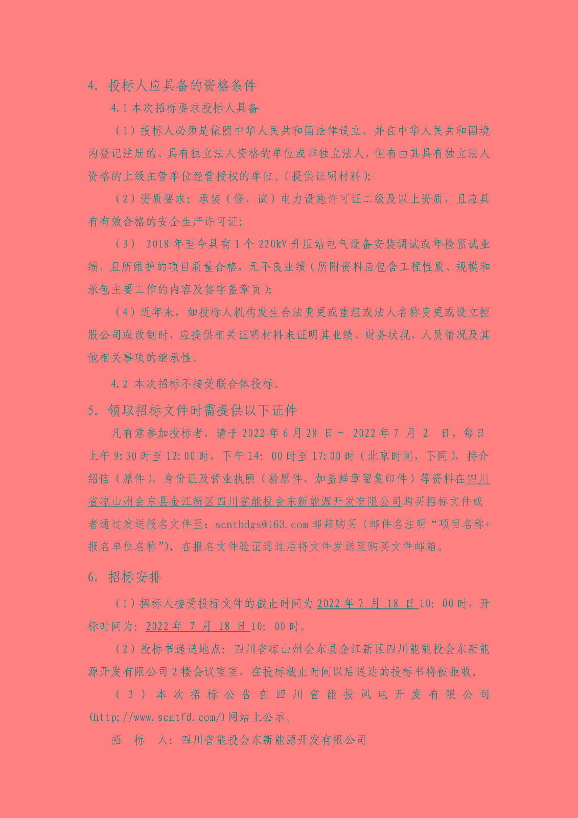 (2)投标书递送地点:四川省凉山州会东县金江新区四川能能投会东新能源开发有限公司2楼会议室室,在投标截止时间以后送达的投标书将被拒收。