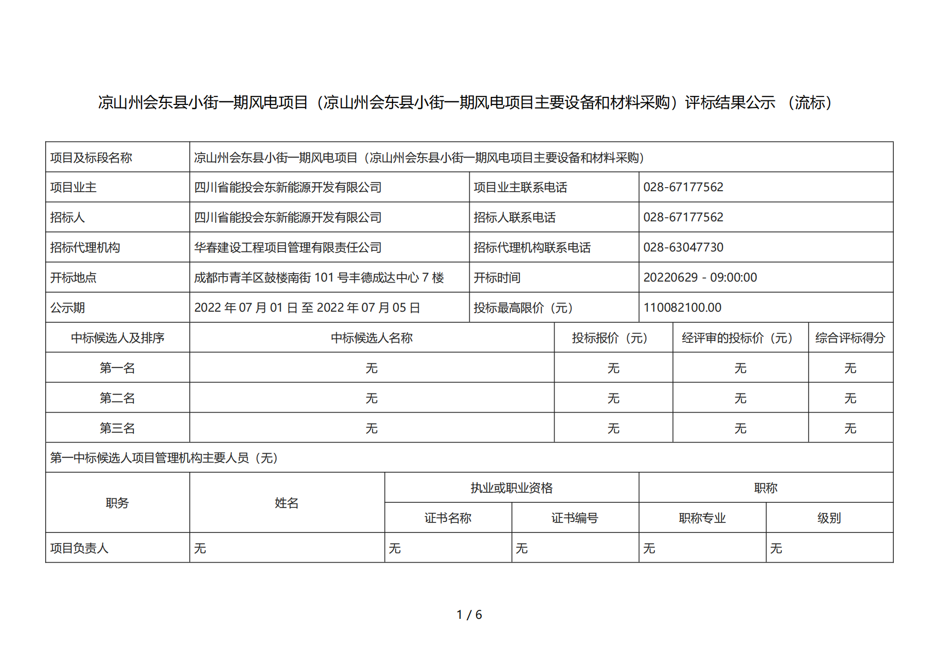 (凉山州会东县小街一期风电项目主要设备和材料采购)评标结果公示 (流标)