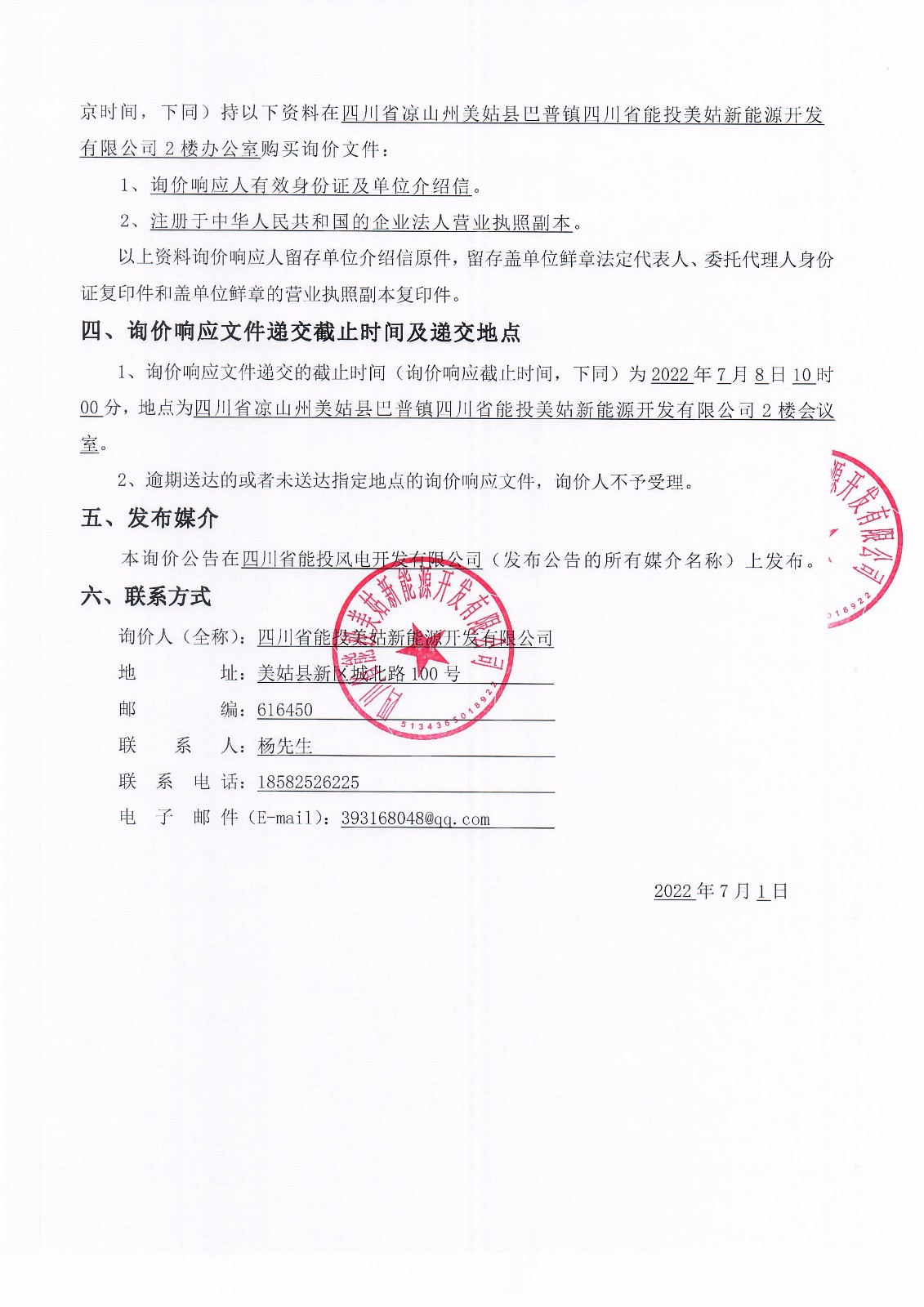 2022年7月2日至2022年7月6日,每日上午9时至11时,下午2时至5时(北京时间,下同)持以下资料在四川省凉山州美姑县巴普镇四川省能投美姑新能源开发有限公司2楼办公室购买询价文件: