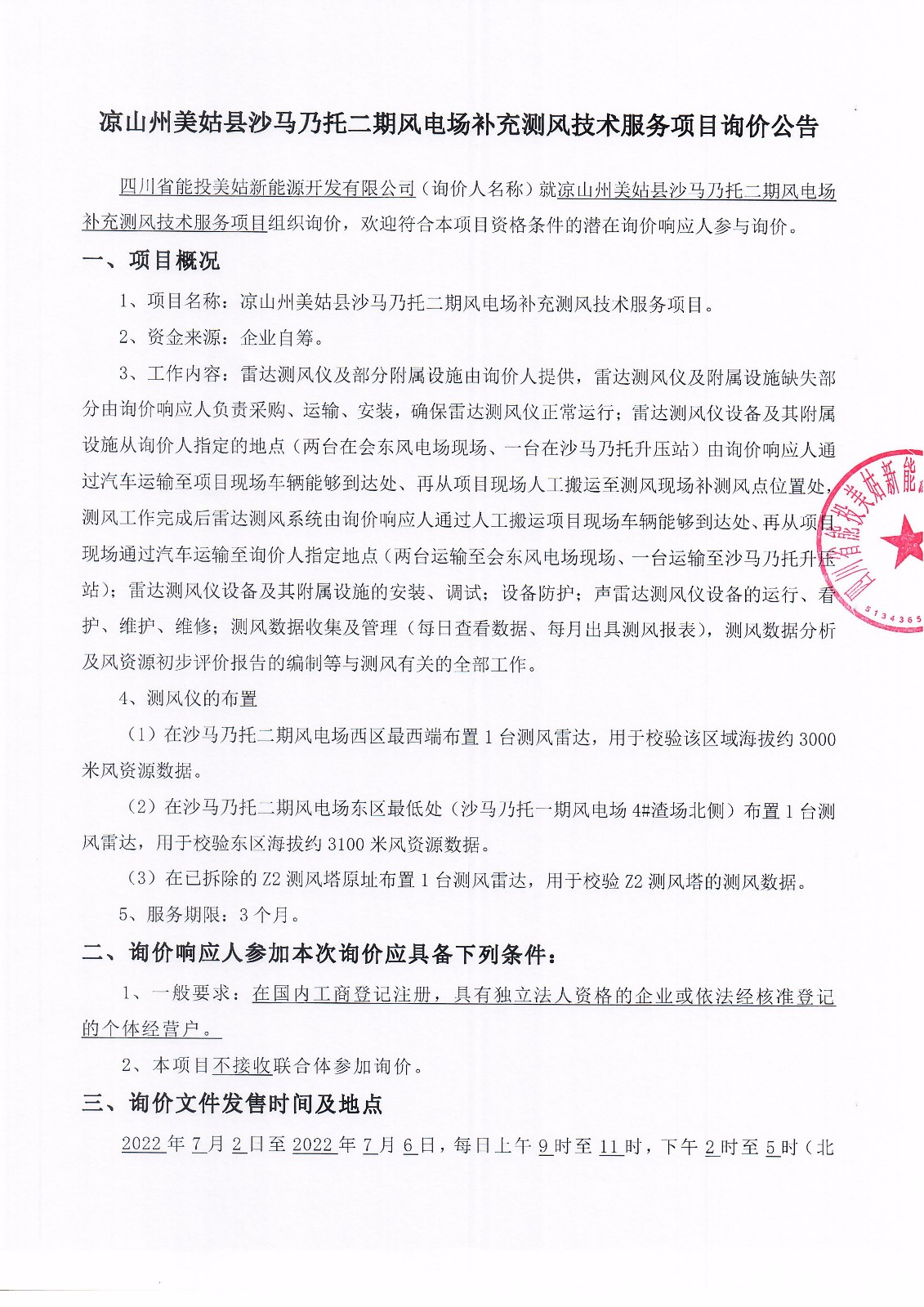 四川省能投美姑新能源开发有限公司(询价人名称)就凉山州美姑县沙马乃托二期风电场补充测风技术服务项目组织询价,欢迎符合本项目资格条件的潜在询价响应人参与询价。