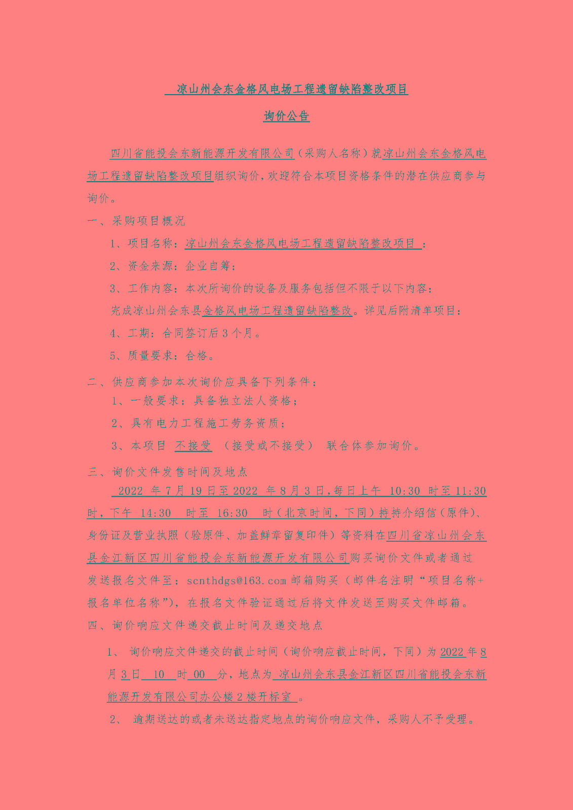 四川省能投会东新能源开发有限公司(采购人名称)就凉山州会东金格风电场工程遗留缺陷整改项目组织询价,欢迎符合本项目资格条件的潜在供应商参与询价。