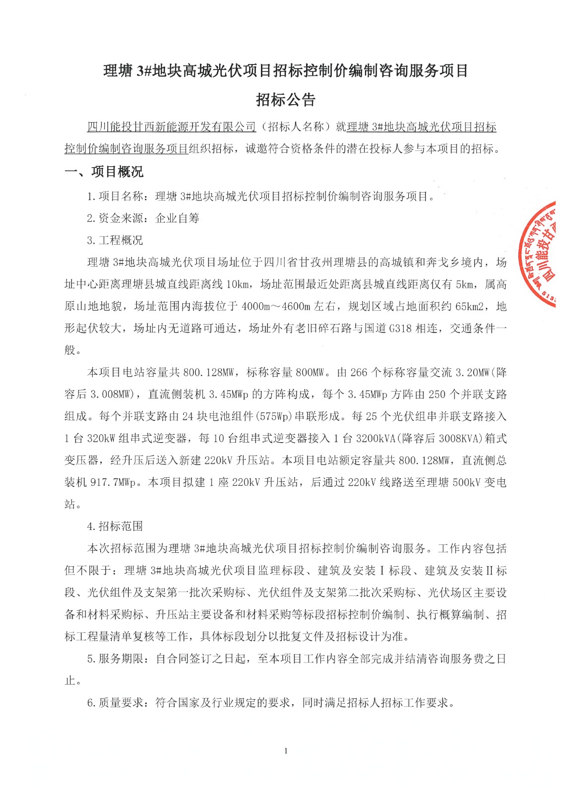 1.项目名称:理塘3#地块高城光伏项目招标控制价编制咨询服务项目。