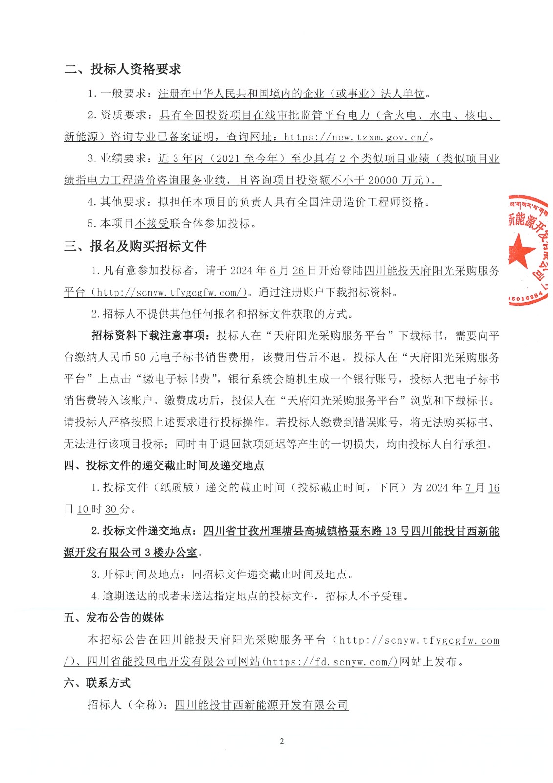 2.投标文件递交地点:四川省甘孜州理塘县高城镇格聂东路13号四川能投甘西新能源开发有限公司3楼办公室。