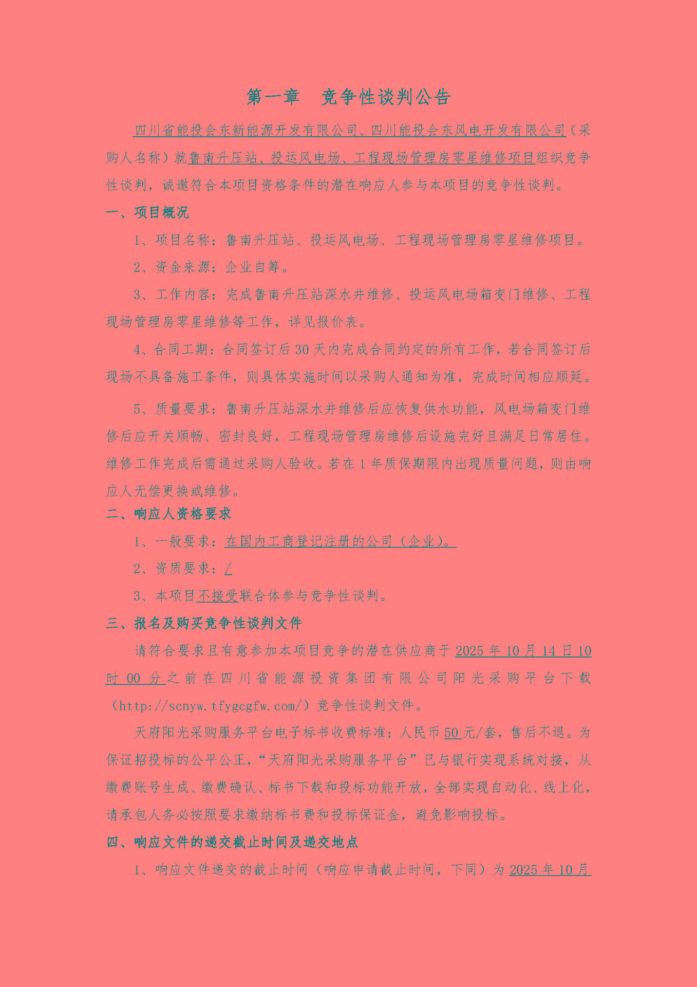 请符合要求且有意参加本项目竞争的潜在供应商于2025年10月14日10时00分之前在四川省能源投资集团有限公司阳光采购平台下载(http://scnyw.tfygcgfw.com/)竞争性谈判文件。