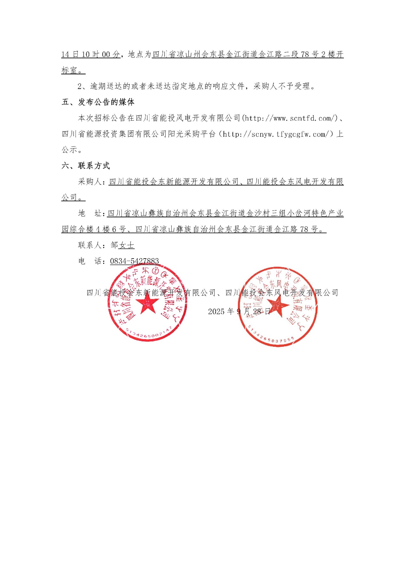 本次招标公告在四川省能投风电开发有限公司(http://www.scntfd.com/)、四川省能源投资集团有限公司阳光采购平台(http://scnyw.tfygcgfw.com/)上公示。