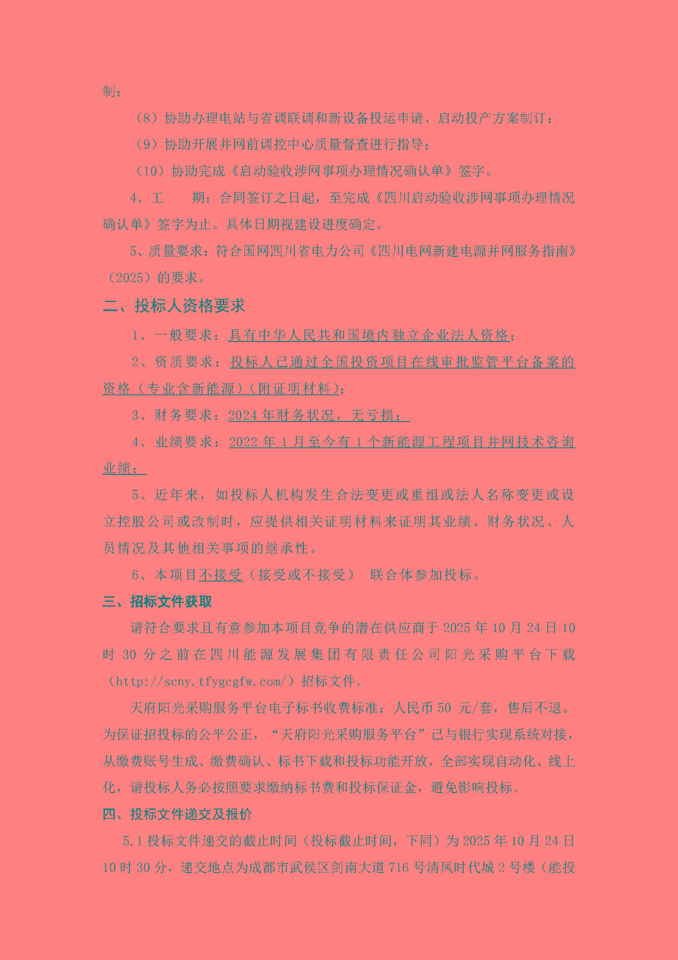 请符合要求且有意参加本项目竞争的潜在供应商于2025年10月24日10时30分之前在四川能源发展集团有限责任公司阳光采购平台下载(http://scny.tfygcgfw.com/)招标文件。