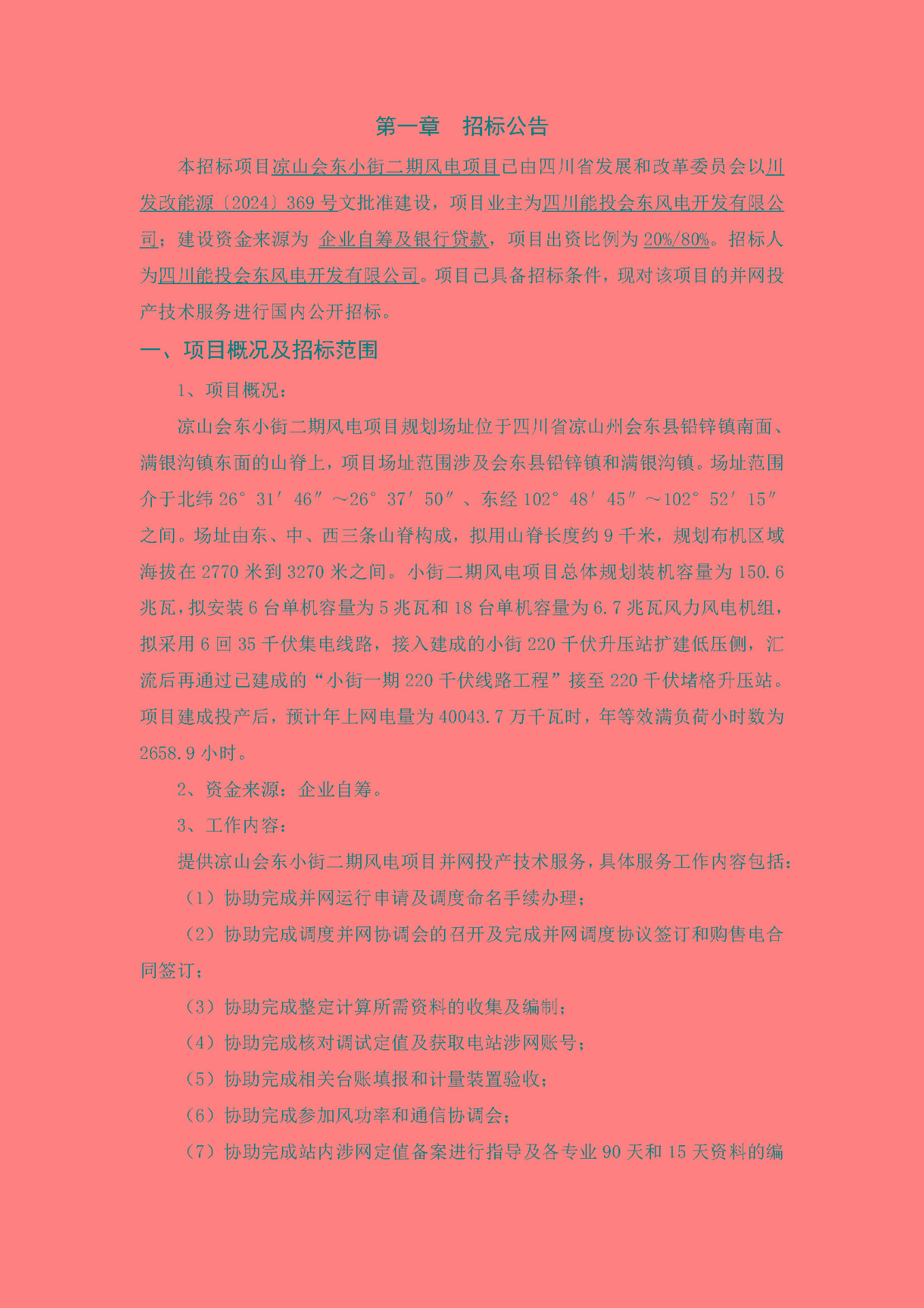 本招标项目凉山会东小街二期风电项目已由四川省发展和改革委员会以川发改能源〔2024〕369号文批准建设,项目业主为四川能投会东风电开发有限公司;建设资金来源为 企业自筹及银行贷款,项目出资比例为20%/80%。招标人为四川能投会东风电开发有限公司。项目已具备招标条件,现对该项目的并网投产技术服务进行国内公开招标。
