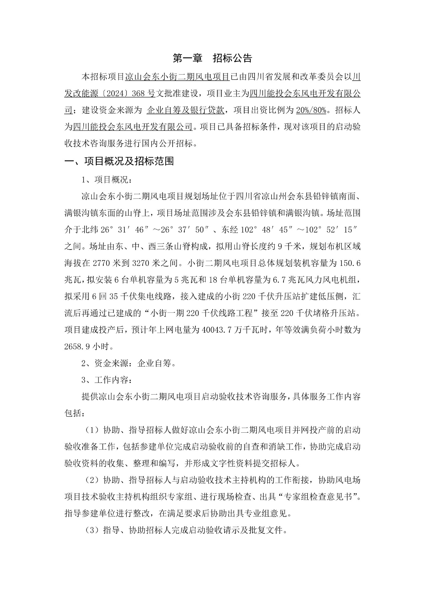 本招标项目凉山会东小街二期风电项目已由四川省发展和改革委员会以川发改能源〔2024〕368号文批准建设,项目业主为四川能投会东风电开发有限公司;建设资金来源为 企业自筹及银行贷款,项目出资比例为20%/80%。招标人为四川能投会东风电开发有限公司。项目已具备招标条件,现对该项目的启动验收技术咨询服务进行国内公开招标。