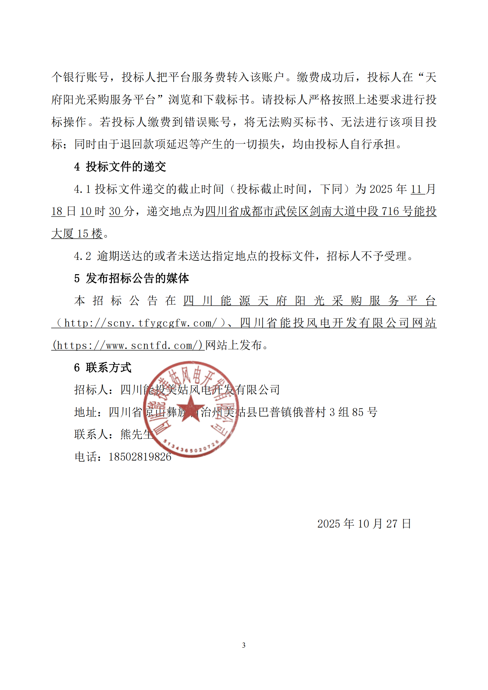 本招标公告在四川能源天府阳光采购服务平台(http://scny.tfygcgfw.com/)、四川省能投风电开发有限公司网站(https://www.scntfd.com/)网站上发布。