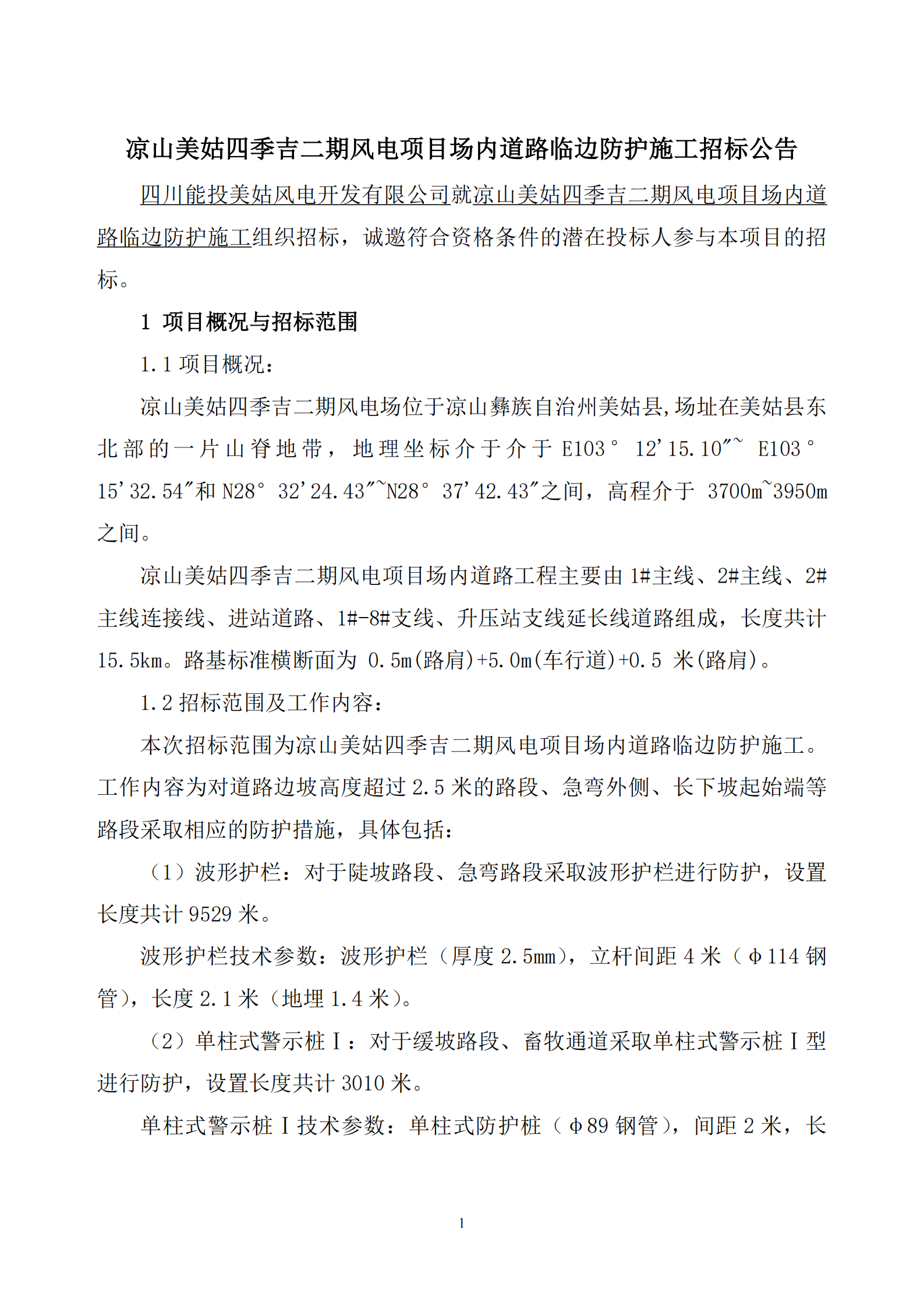 四川能投美姑风电开发有限公司就凉山美姑四季吉二期风电项目场内道路临边防护施工组织招标,诚邀符合资格条件的潜在投标人参与本项目的招标。