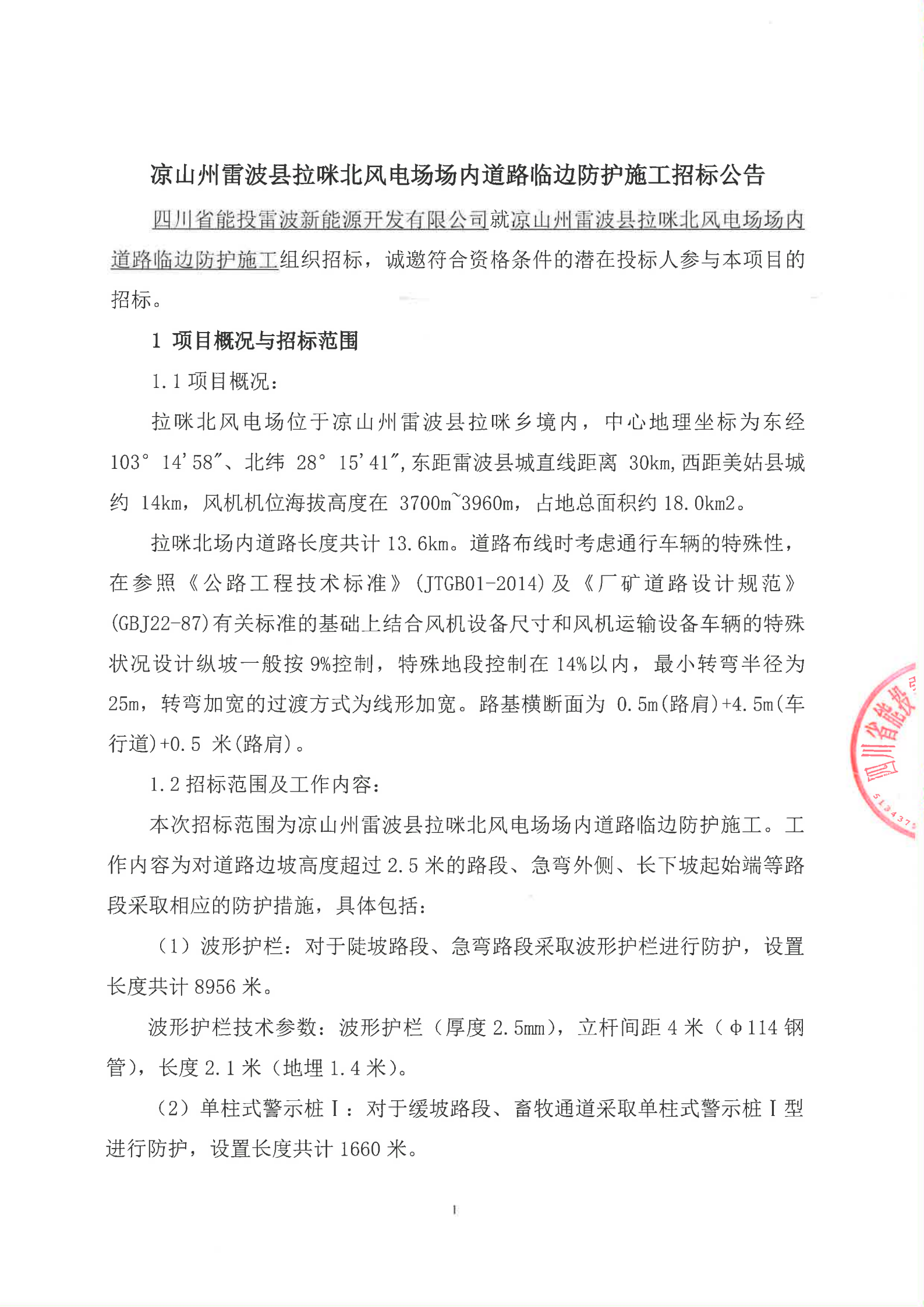 四川省能投雷波新能源开发有限公司就凉山州雷波县拉咪北风电场场内道路临边防护施工组织招标,诚邀符合资格条件的潜在投标人参与本项目的招标。