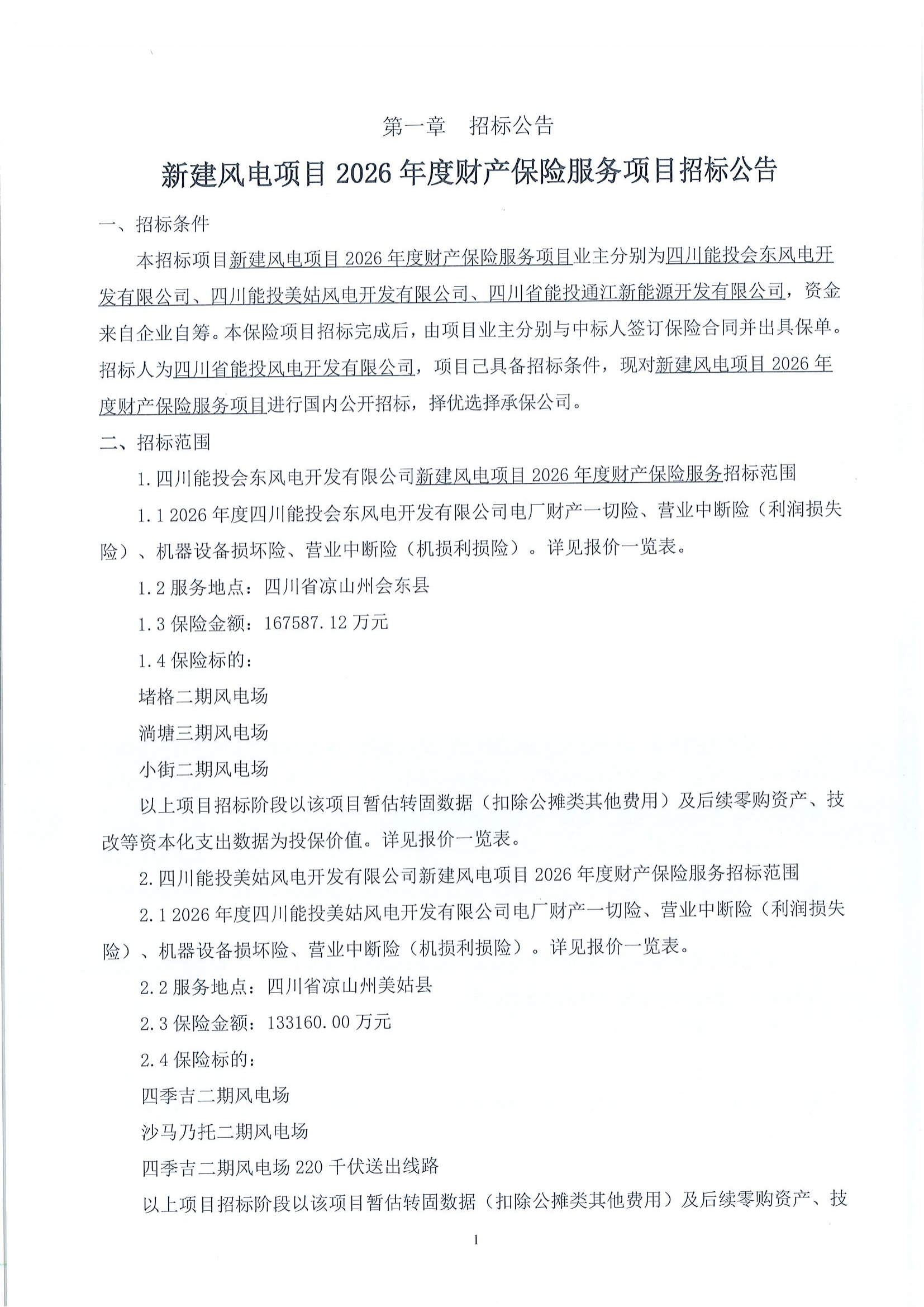 1.四川能投会东风电开发有限公司新建风电项目2026年度财产保险服务招标范围