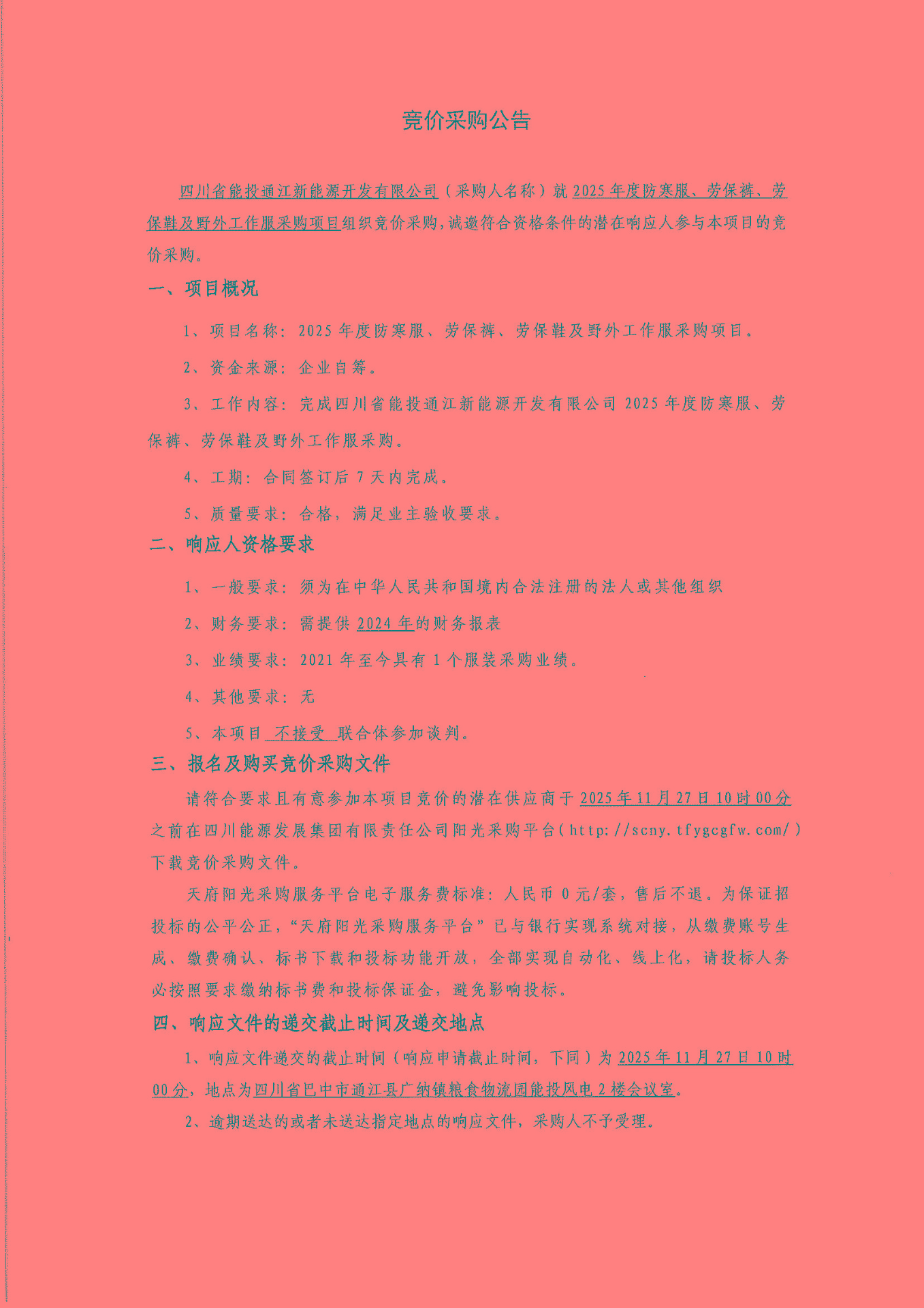 四川省能投通江新能源开发有限公司(采购人名称)就2025年度防寒服、劳保裤、劳保鞋及野外工作服采购项目组织竞价采购,诚邀符合资格条件的潜在响应人参与本项目的竞价采购。