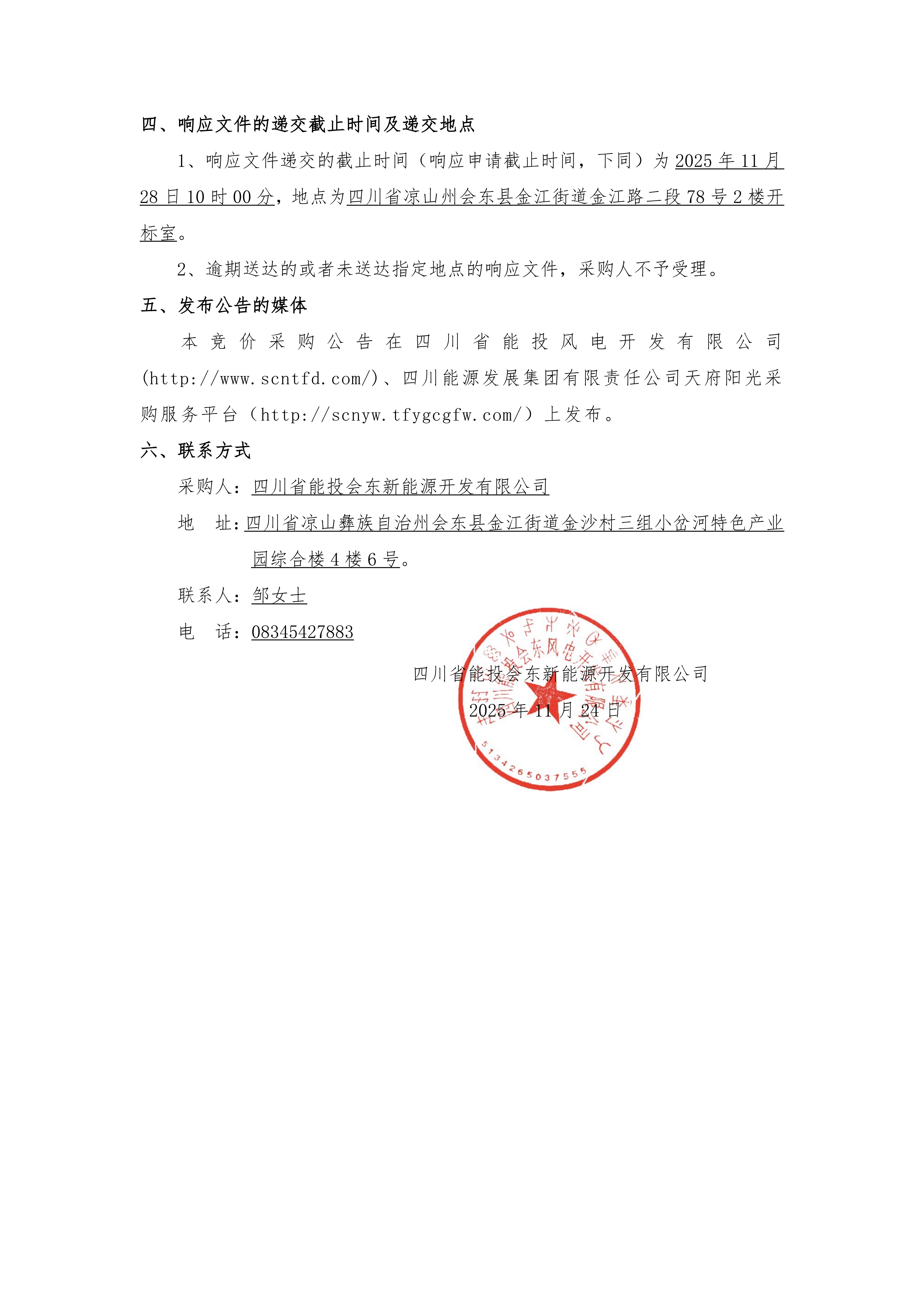 请符合要求且有意参加本项目竞争的潜在供应商于2025年11月28日10时00分之前在四川能源发展集团有限责任公司阳光采购平台(http://scnyw.tfygcgfw.com/)下载竞价采购文件。