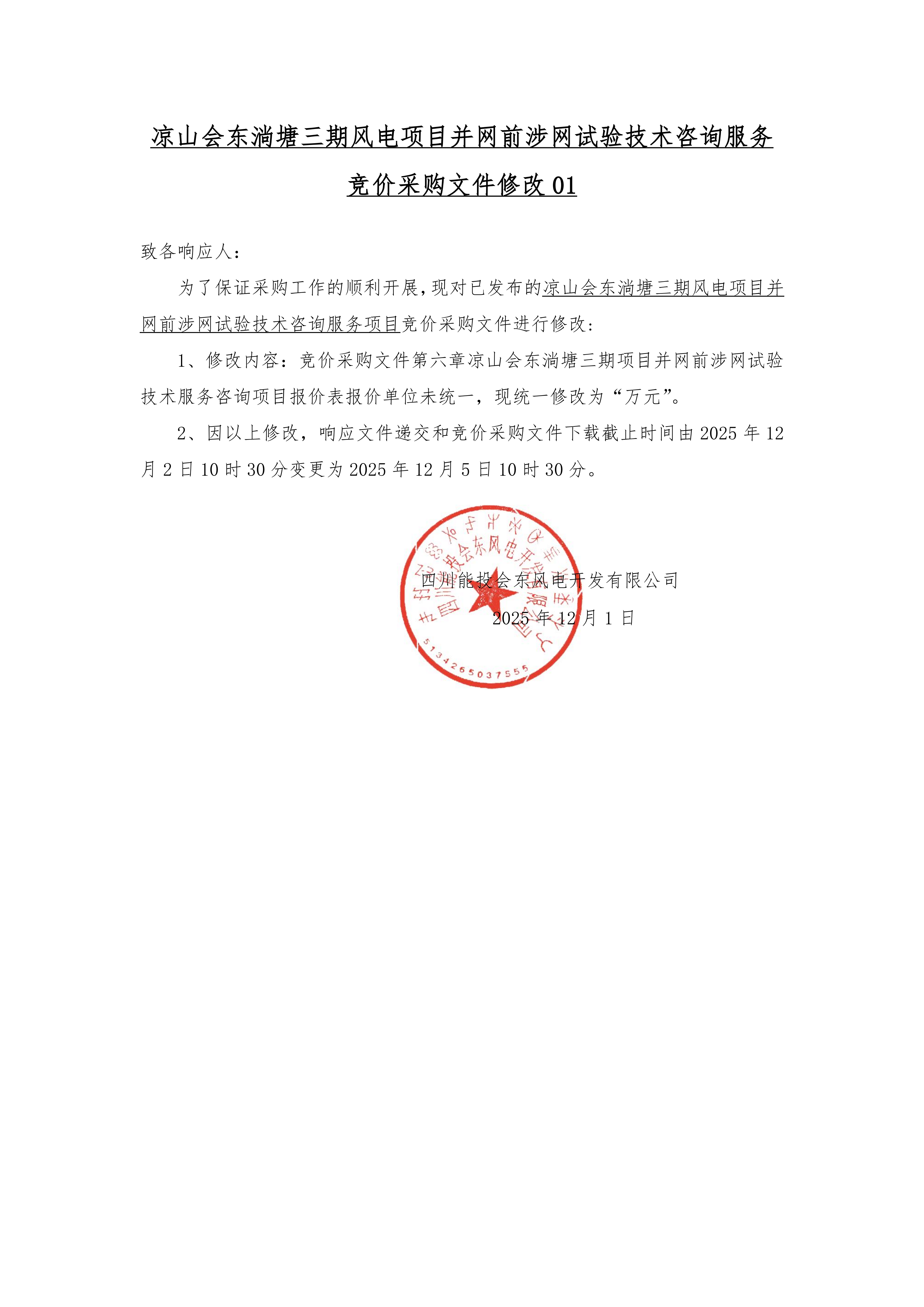 为了保证采购工作的顺利开展,现对已发布的凉山会东淌塘三期风电项目并网前涉网试验技术咨询服务项目竞价采购文件进行修改: