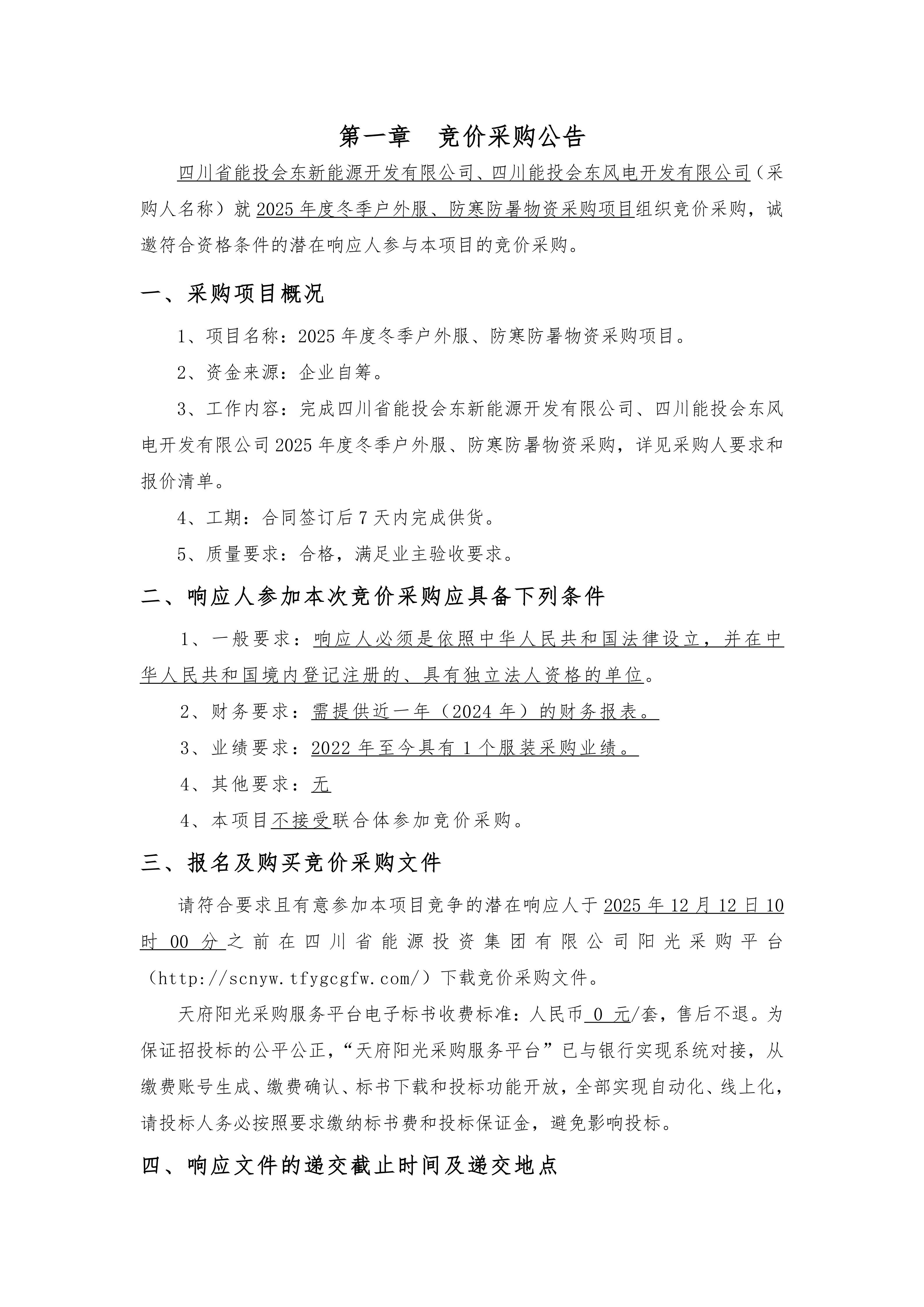 3、工作内容:完成四川省能投会东新能源开发有限公司、四川能投会东风电开发有限公司2025年度冬季户外服、防寒防暑物资采购,详见采购人要求和报价清单。