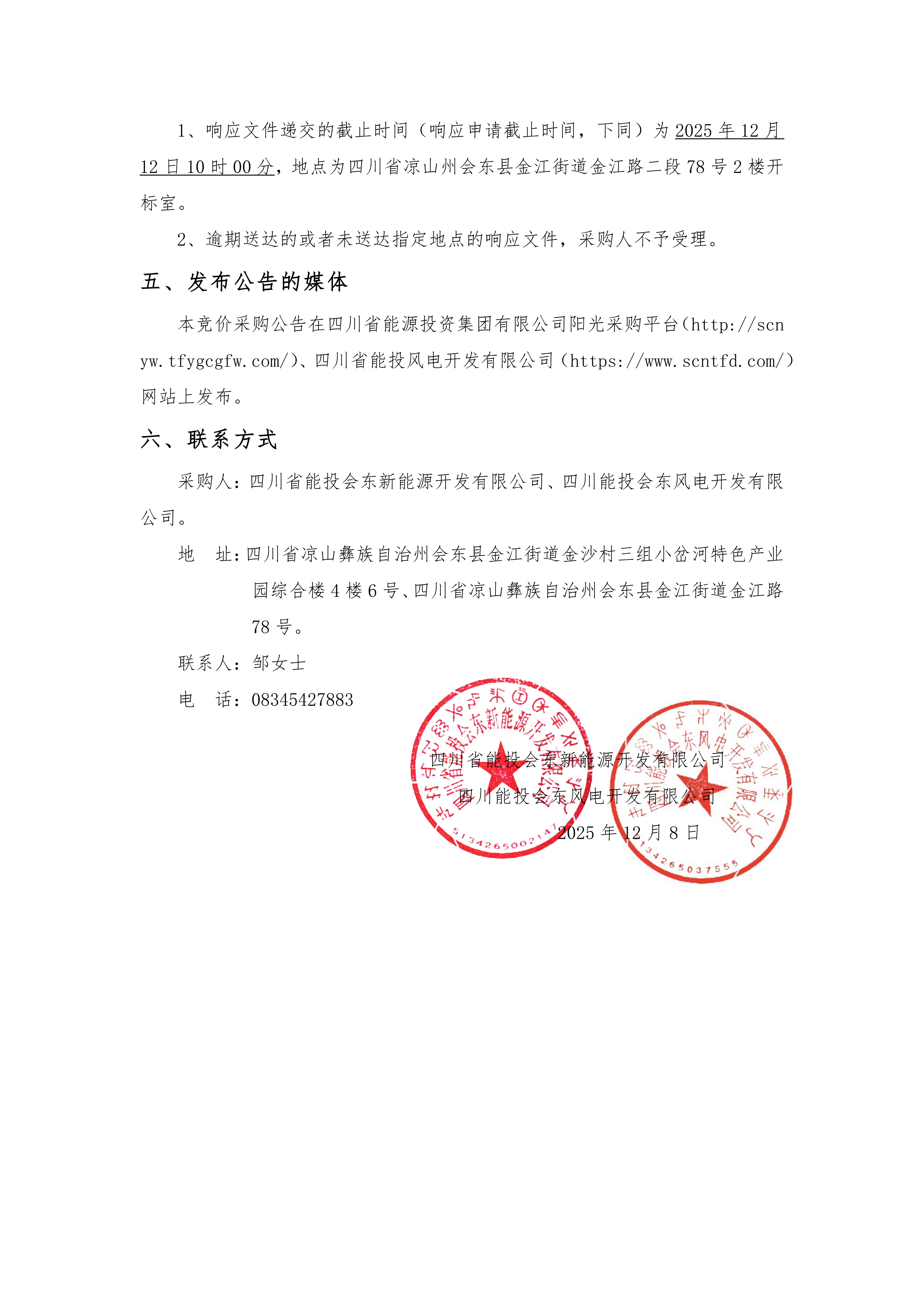 本竞价采购公告在四川省能源投资集团有限公司阳光采购平台(http://scnyw.tfygcgfw.com/)、四川省能投风电开发有限公司(https://www.scntfd.com/)网站上发布。
