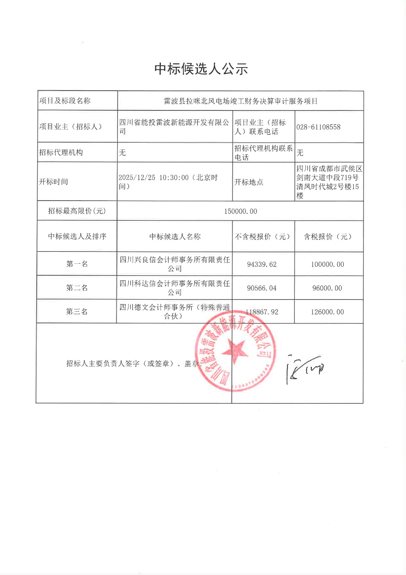 上一条:四川省能投雷波新能源开发有限公司关于雷波县拉咪北风电场工结算审计服务项目的中标候选人公示