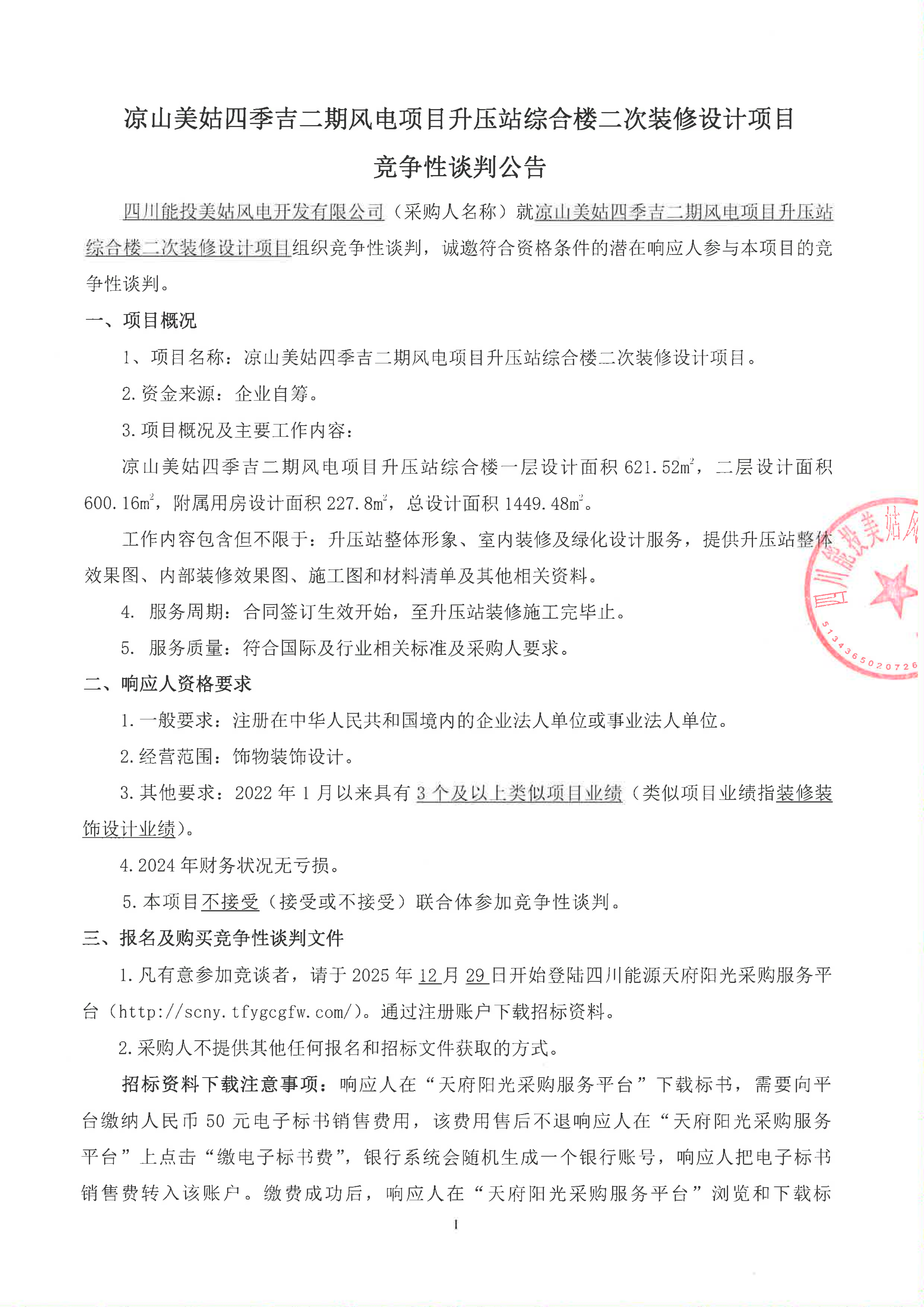 四川能投美姑风电开发有限公司(采购人名称)就凉山美姑四季吉二期风电项目升压站综合楼二次装修设计项目组织竞争性谈判,诚邀符合资格条件的潜在响应人参与本项目的竞争性谈判。