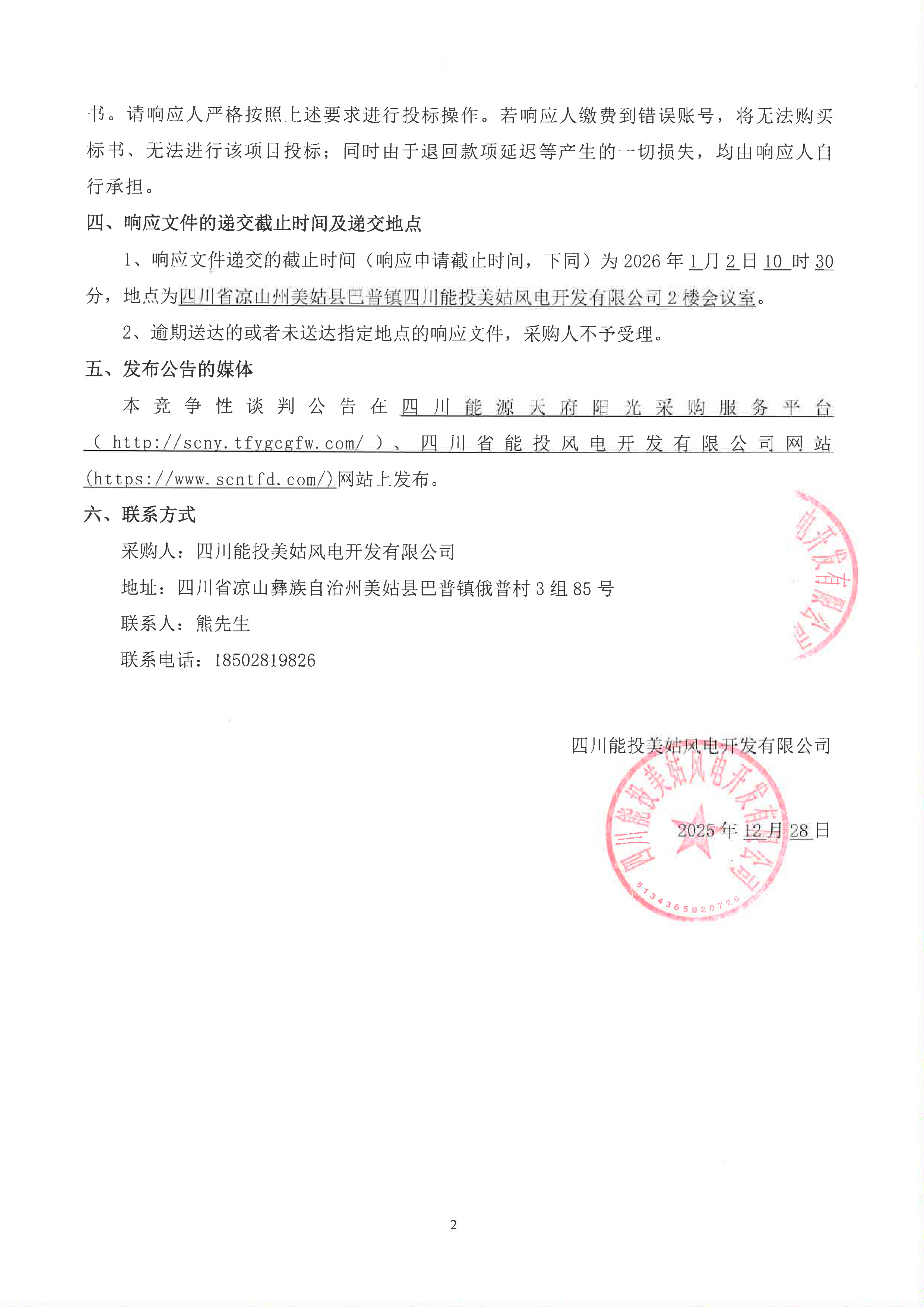 1、响应文件递交的截止时间(响应申请截止时间,下同)为2026年1月2日10 时30分,地点为四川省凉山州美姑县巴普镇四川能投美姑风电开发有限公司2楼会议室。