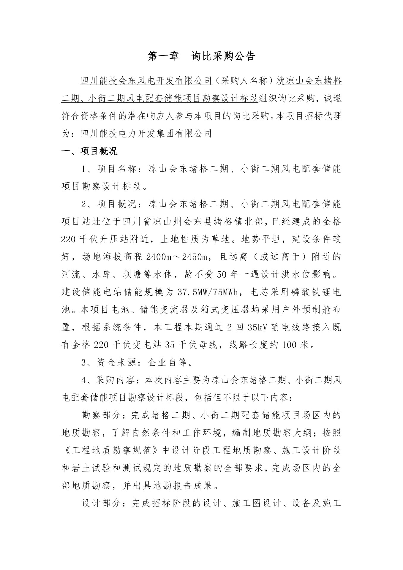 四川能投会东风电开发有限公司(采购人名称)就凉山会东堵格二期、小街二期风电配套储能项目勘察设计标段组织询比采购,诚邀符合资格条件的潜在响应人参与本项目的询比采购。本项目招标代理为:四川能投电力开发集团有限公司
