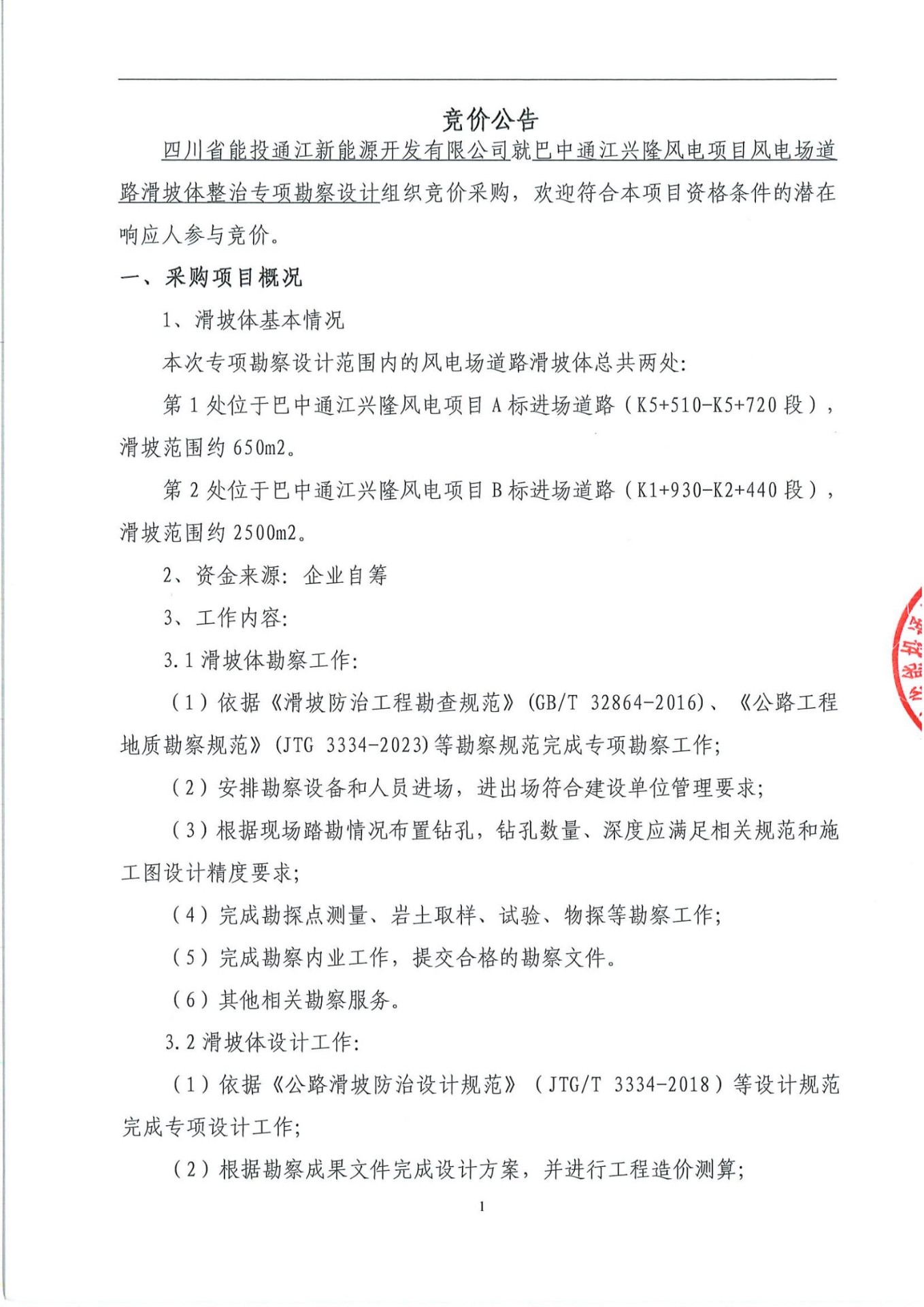 四川省能投通江新能源开发有限公司就巴中通江兴隆风电项目风电场道路滑坡体整治专项勘察设计组织竞价采购,欢迎符合本项目资格条件的潜在响应人参与竞价。