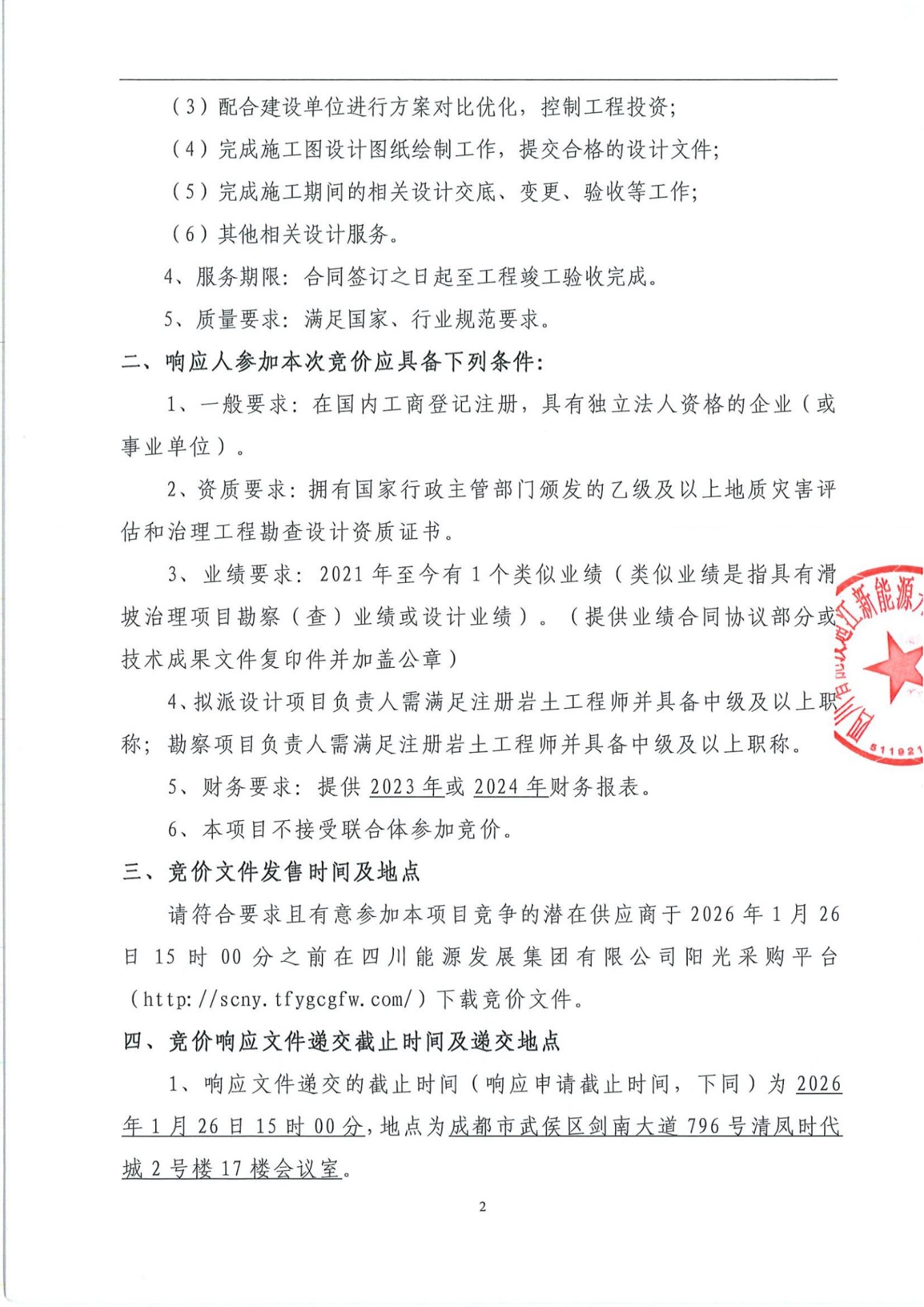 请符合要求且有意参加本项目竞争的潜在供应商于2026年1月26日15时00分之前在四川能源发展集团有限公司阳光采购平台(http://scny.tfygcgfw.com/)下载竞价文件。