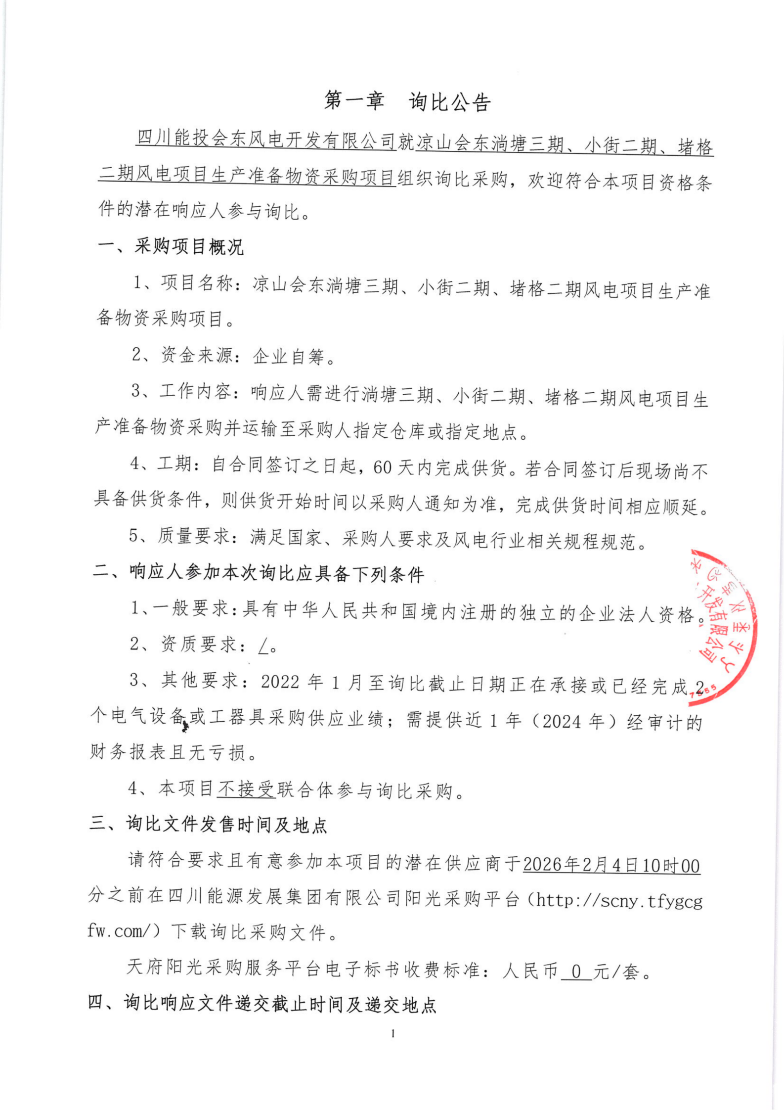 四川能投会东风电开发有限公司就凉山会东淌塘三期、小街二期、堵格二期风电项目生产准备物资采购项目组织询比采购,欢迎符合本项目资格条件的潜在响应人参与询比。