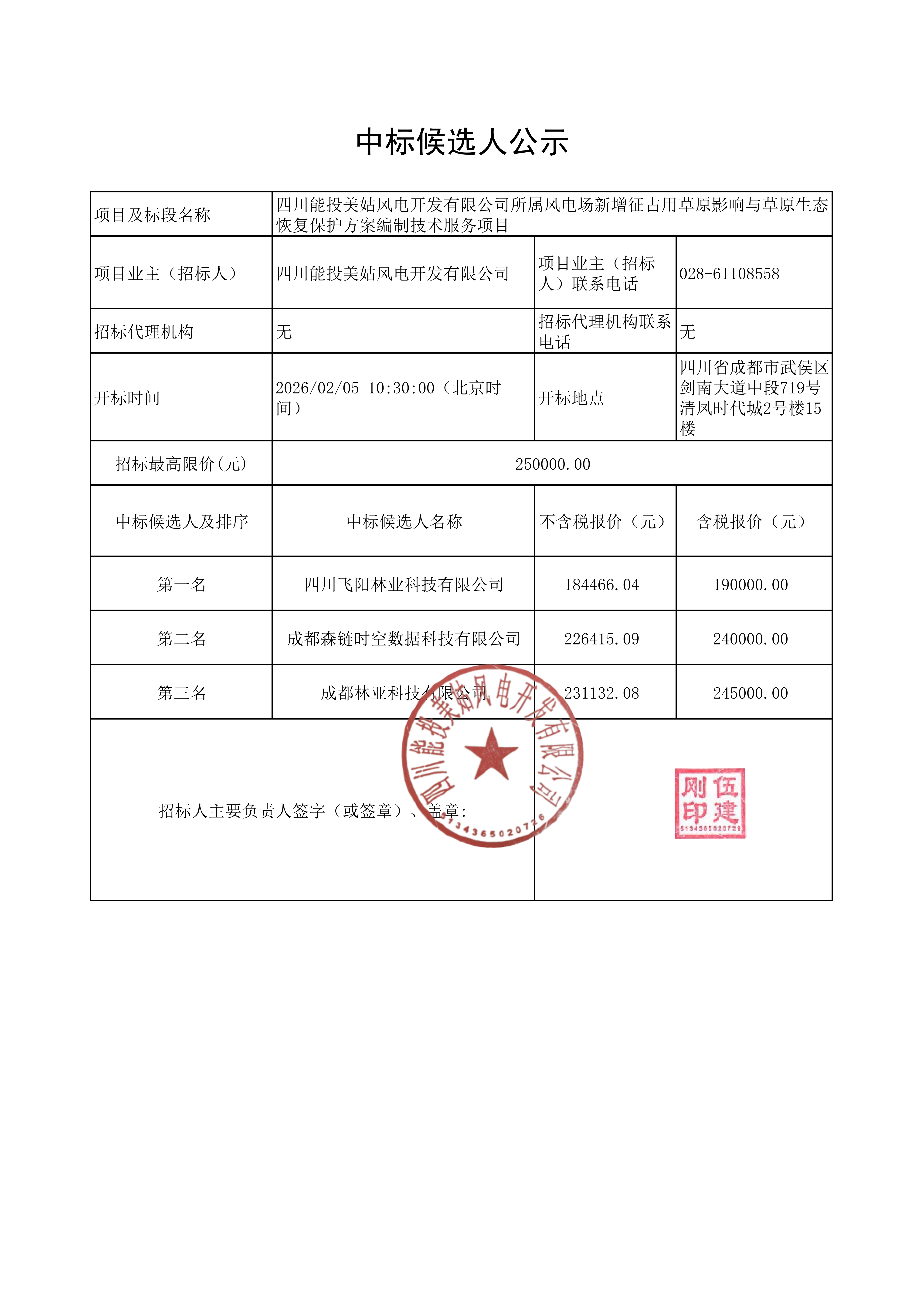 上一条:四川能投美姑风电开发有限公司关于四川能投美姑风电开发有限公司所属风电场新增拟使用林地可行性报告及采伐作业设计技术服务项目的中标候选人公示