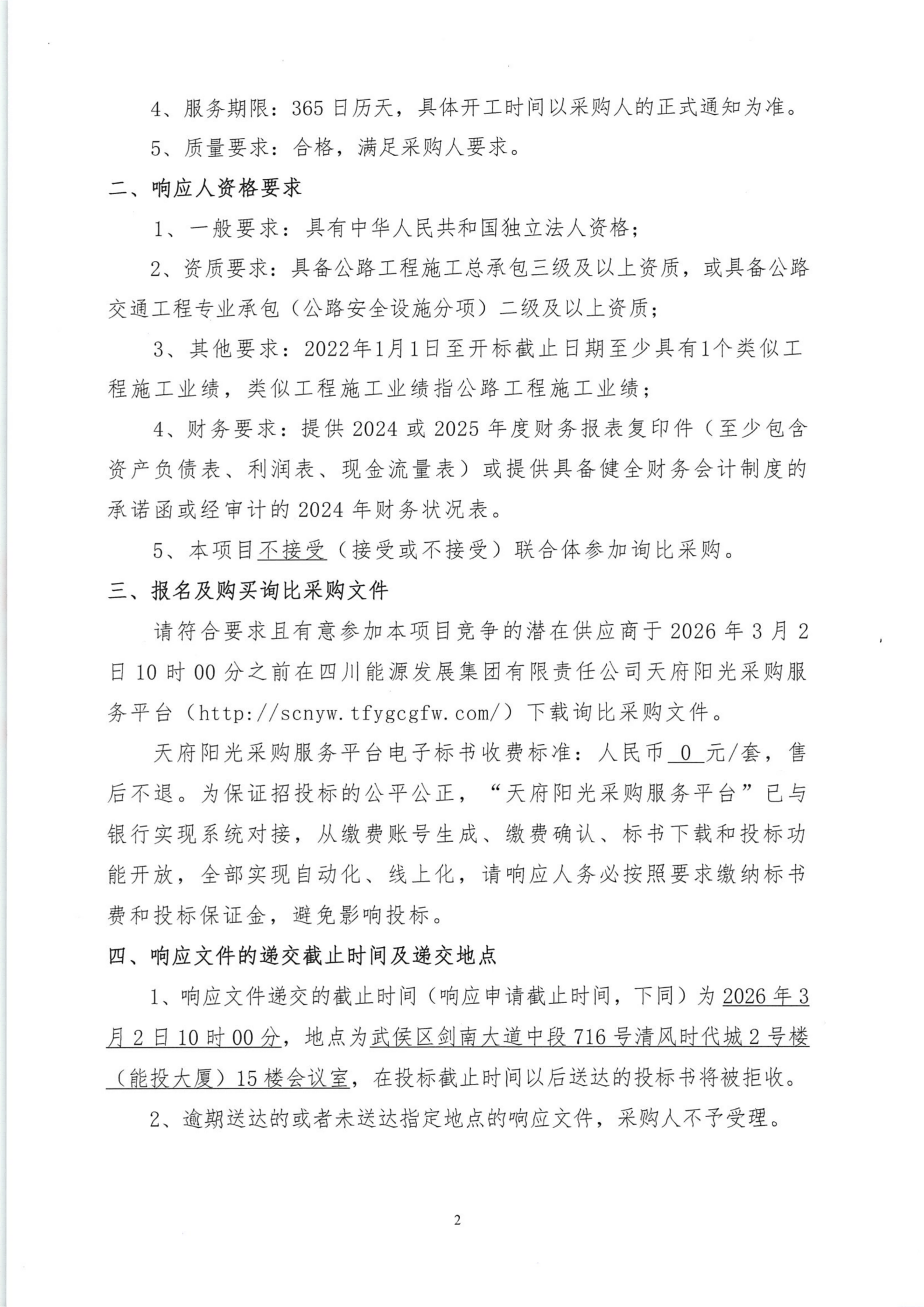 请符合要求且有意参加本项目竞争的潜在供应商于2026年3月2日10时00分之前在四川能源发展集团有限责任公司天府阳光采购服务平台(http://scnyw.tfygcgfw.com/)下载询比采购文件。