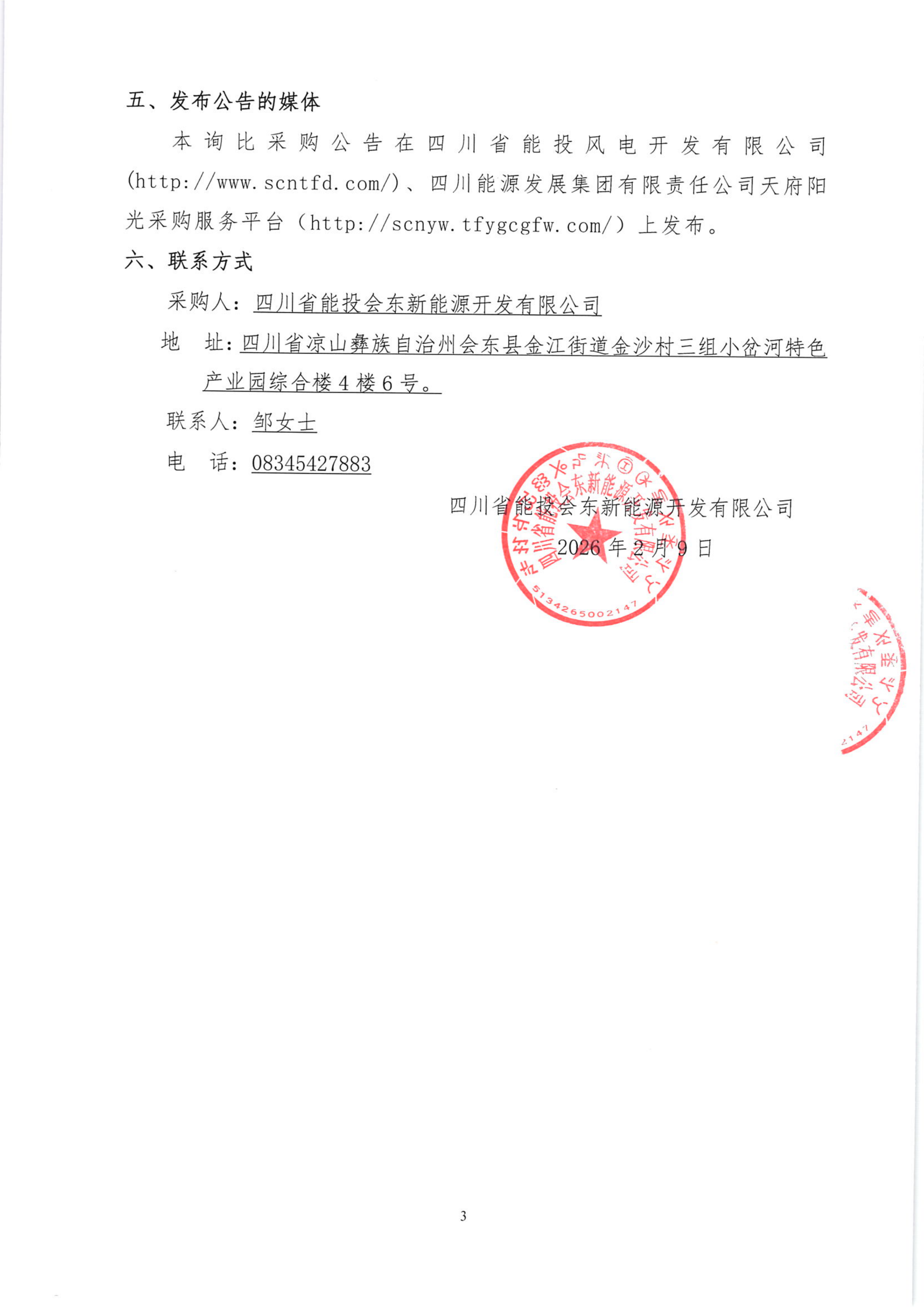 本询比采购公告在四川省能投风电开发有限公司(http://www.scntfd.com/)、四川能源发展集团有限责任公司天府阳光采购服务平台(http://scnyw.tfygcgfw.com/)上发布。