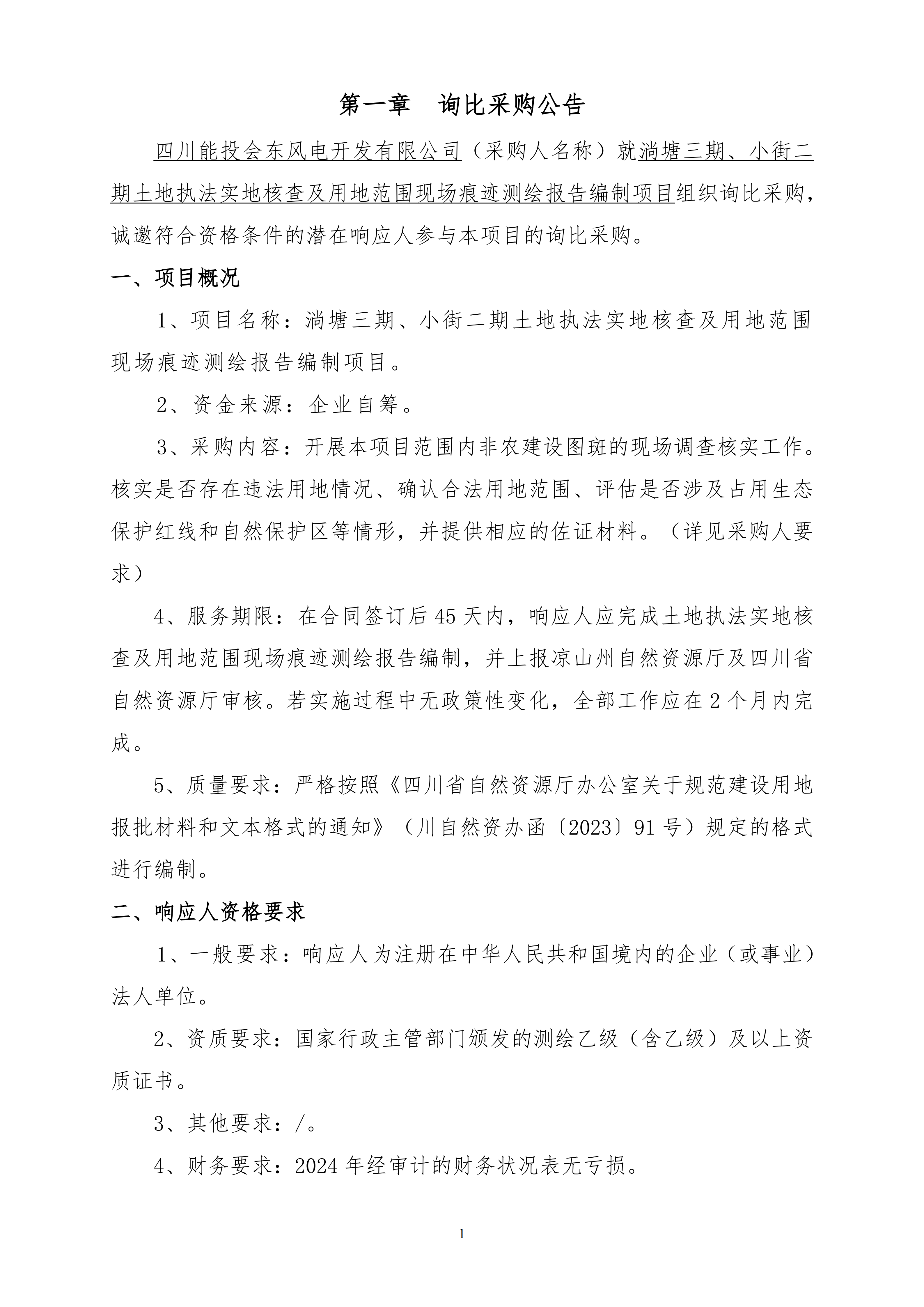 四川能投会东风电开发有限公司(采购人名称)就淌塘三期、小街二期土地执法实地核查及用地范围现场痕迹测绘报告编制项目组织询比采购,诚邀符合资格条件的潜在响应人参与本项目的询比采购。