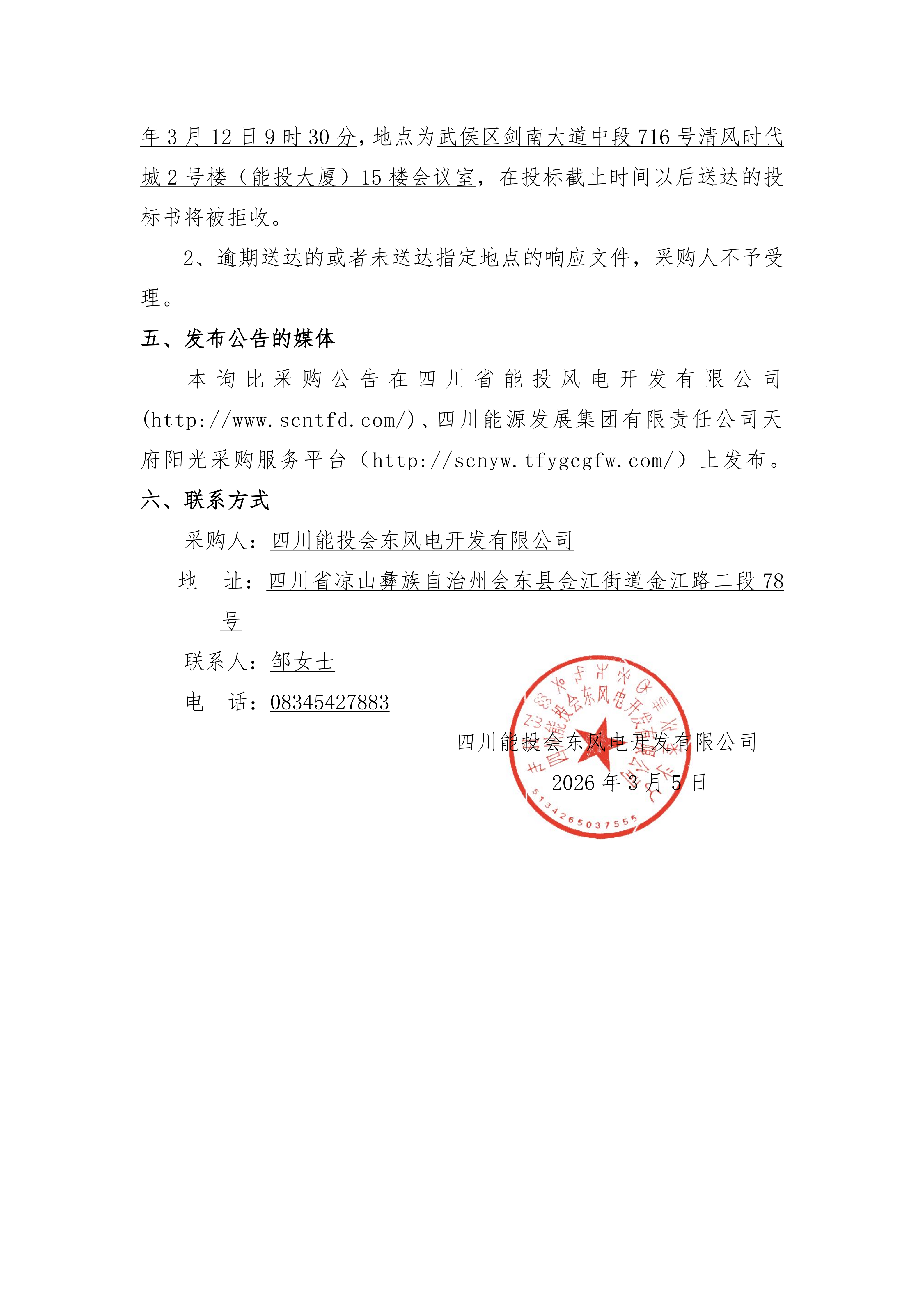 本询比采购公告在四川省能投风电开发有限公司(http://www.scntfd.com/)、四川能源发展集团有限责任公司天府阳光采购服务平台(http://scnyw.tfygcgfw.com/)上发布。