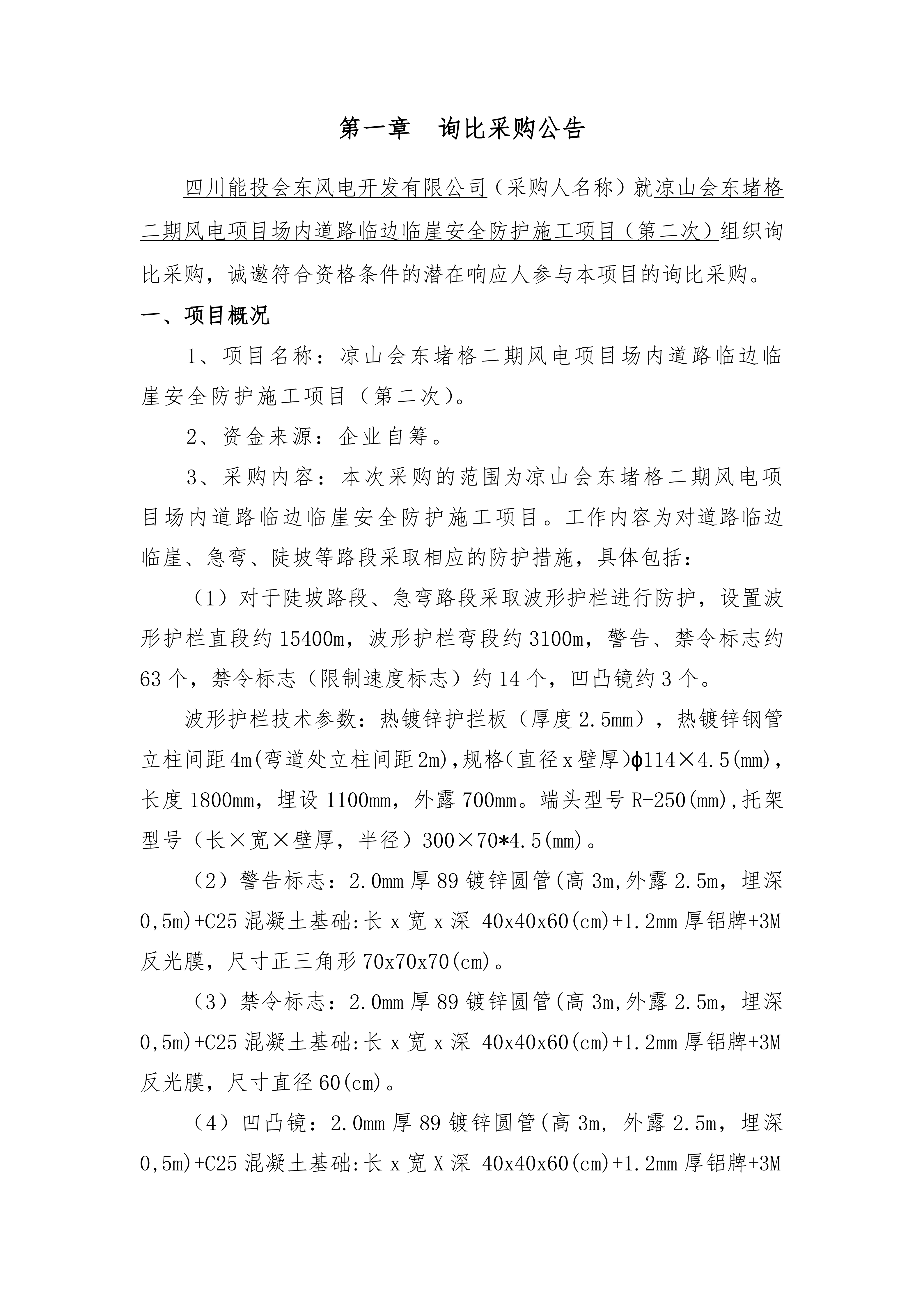 四川能投会东风电开发有限公司(采购人名称)就凉山会东堵格二期风电项目场内道路临边临崖安全防护施工项目(第二次)组织询比采购,诚邀符合资格条件的潜在响应人参与本项目的询比采购。