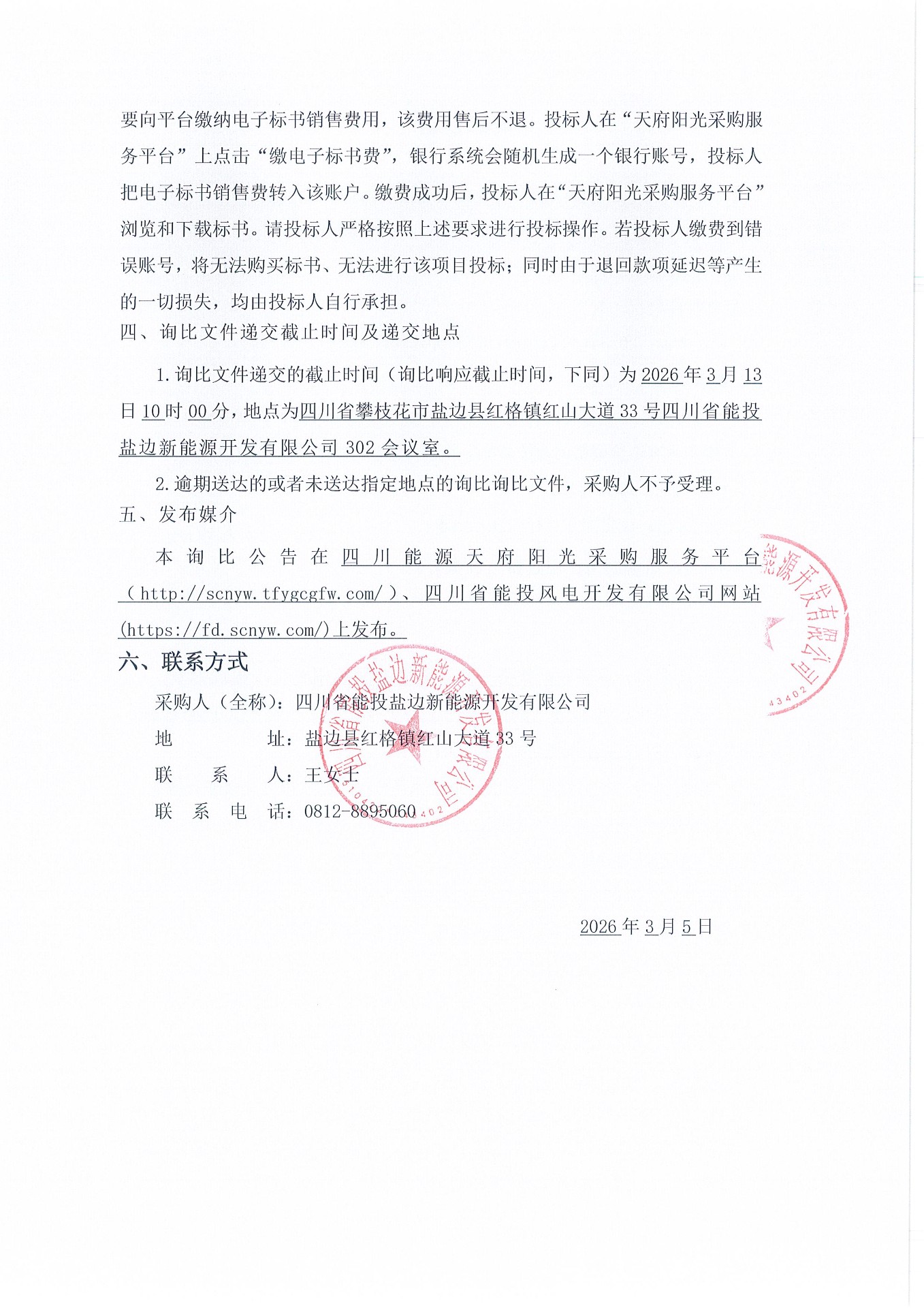 1.询比文件递交的截止时间(询比响应截止时间,下同)为2026年3月13日10时00分,地点为四川省攀枝花市盐边县红格镇红山大道33号四川省能投盐边新能源开发有限公司302会议室。