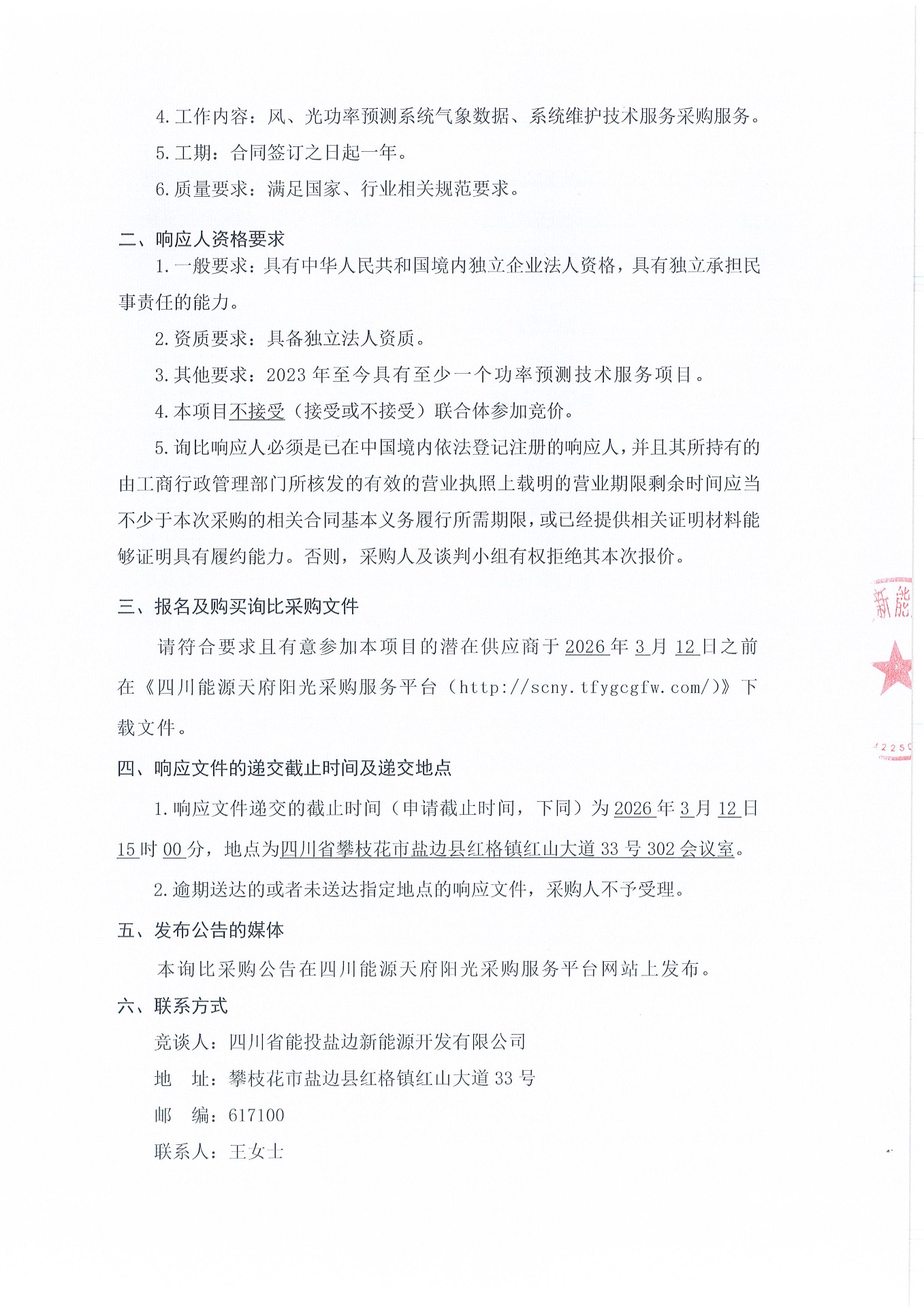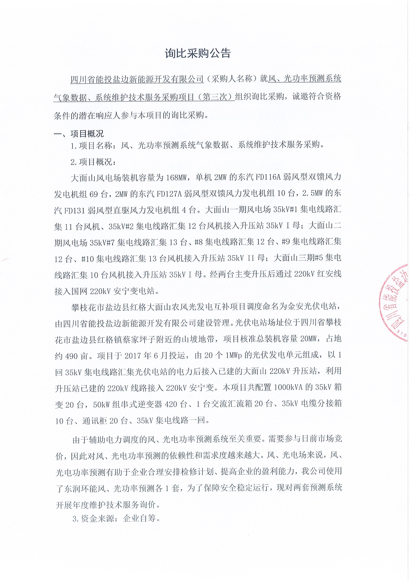 四川省能投盐边新能源开发有限公司(采购人名称)就风、光功率预测系统气象数据、系统维护技术服务采购项目(第三次)组织询比采购,诚邀符合资格条件的潜在响应人参与本项目的询比采购。