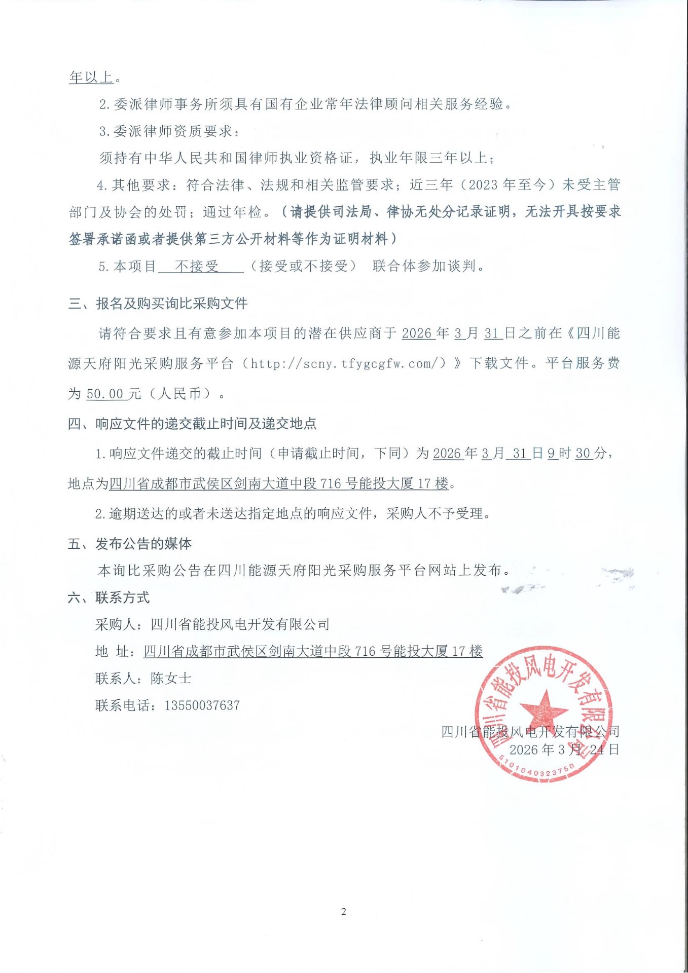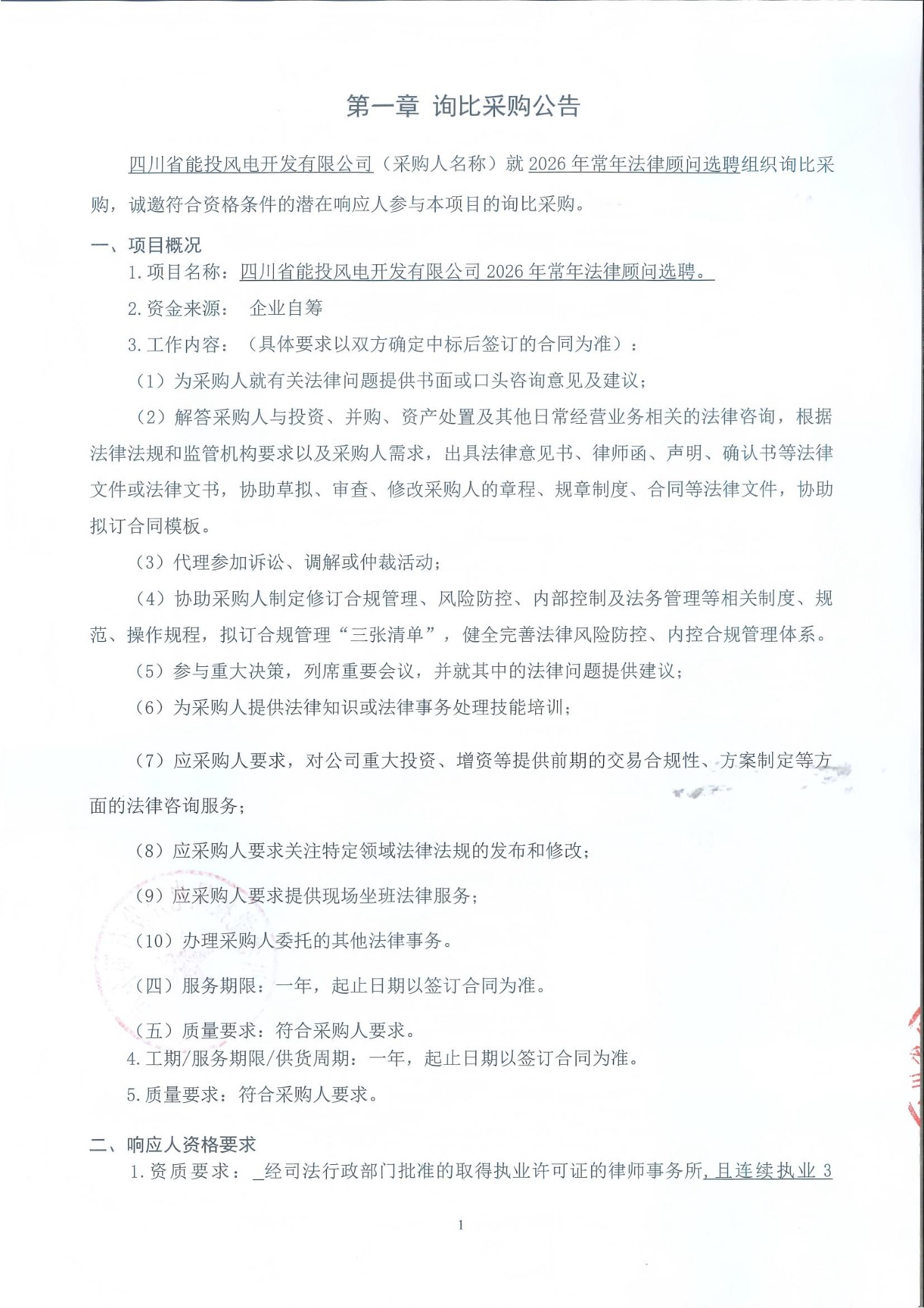 四川省能投风电开发有限公司(采购人名称)就2026年常年法律顾问选聘组织询比采购,诚邀符合资格条件的潜在响应人参与本项目的询比采购。