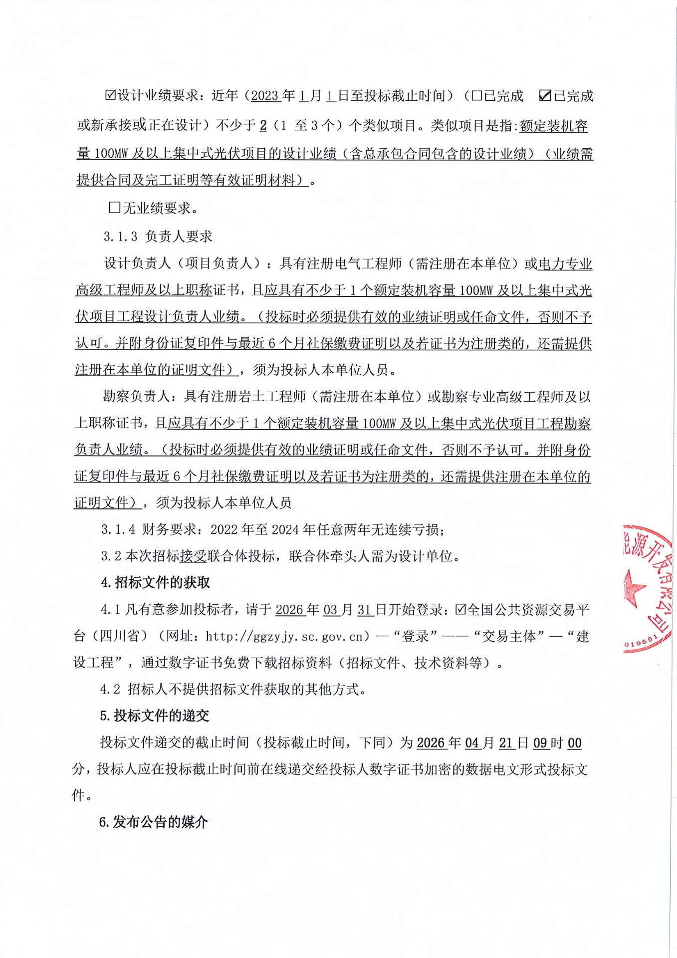 R设计业绩要求:近年(2023年1月1日至投标截止时间)(£已完成 ☑已完成或新承接或正在设计)不少于2(1 至3个)个类似项目。类似项目是指:额定装机容量100MW及以上集中式光伏项目的设计业绩(含总承包合同包含的设计业绩)(业绩需提供合同及完工证明等有效证明材料)。