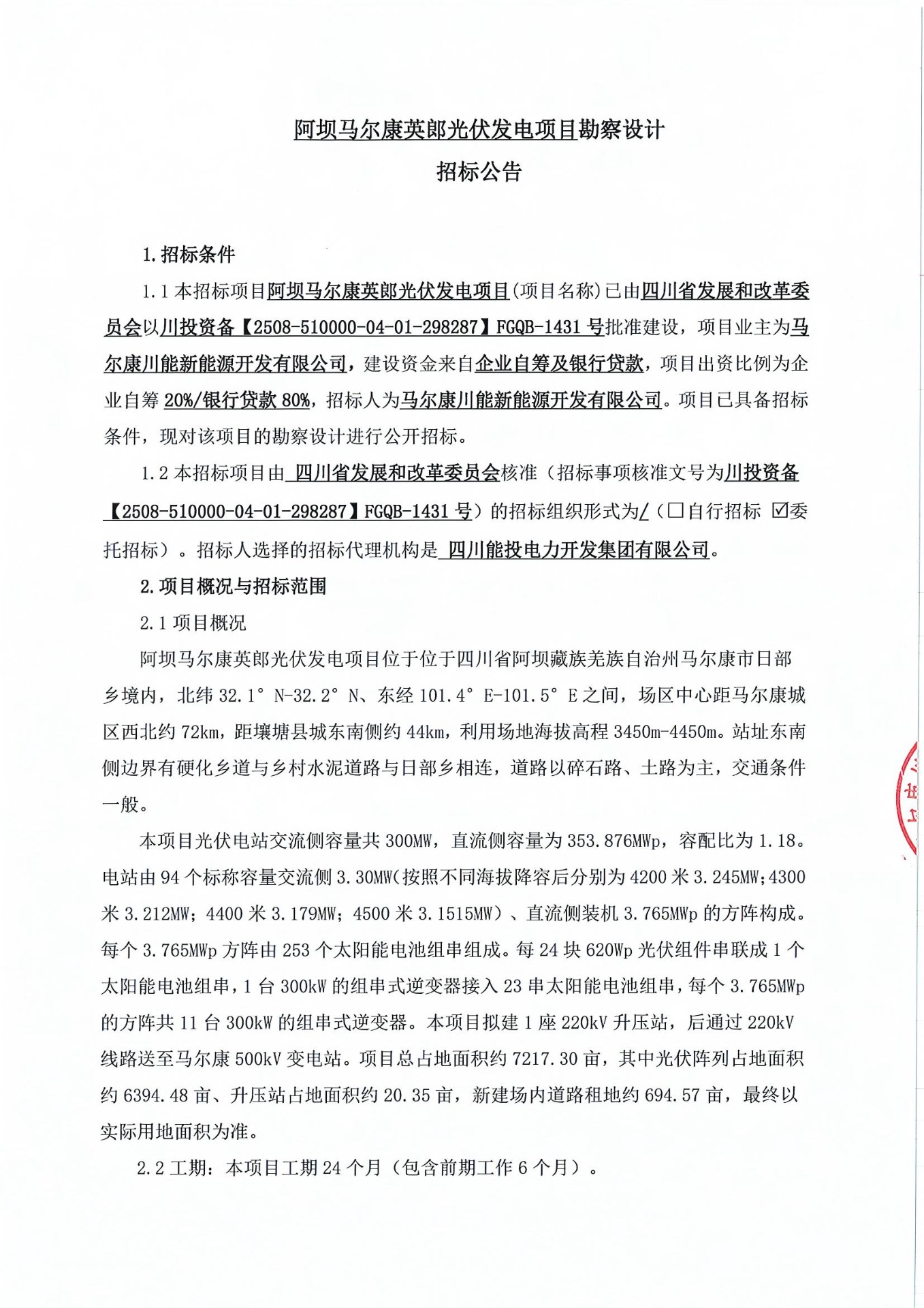 1.1本招标项目阿坝马尔康英郎光伏发电项目(项目名称)已由四川省发展和改革委员会以川投资备【2508-510000-04-01-298287】FGQB-1431号批准建设,项目业主为马尔康川能新能源开发有限公司,建设资金来自企业自筹及银行贷款,项目出资比例为企业自筹20%/银行贷款80%,招标人为马尔康川能新能源开发有限公司。项目已具备招标条件,现对该项目的勘察设计进行公开招标。
