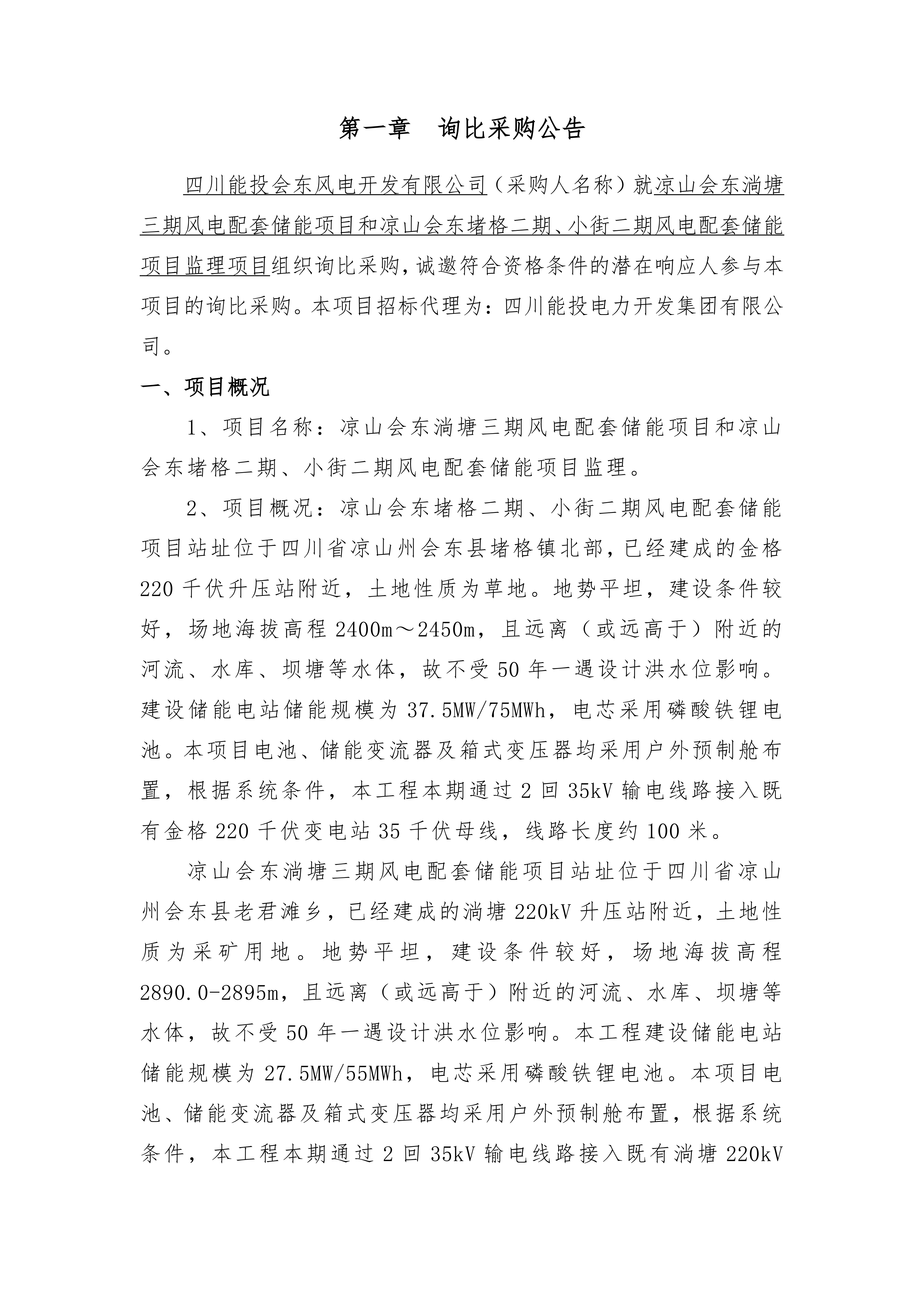四川能投会东风电开发有限公司(采购人名称)就凉山会东淌塘三期风电配套储能项目和凉山会东堵格二期、小街二期风电配套储能项目监理项目组织询比采购,诚邀符合资格条件的潜在响应人参与本项目的询比采购。本项目招标代理为:四川能投电力开发集团有限公司。